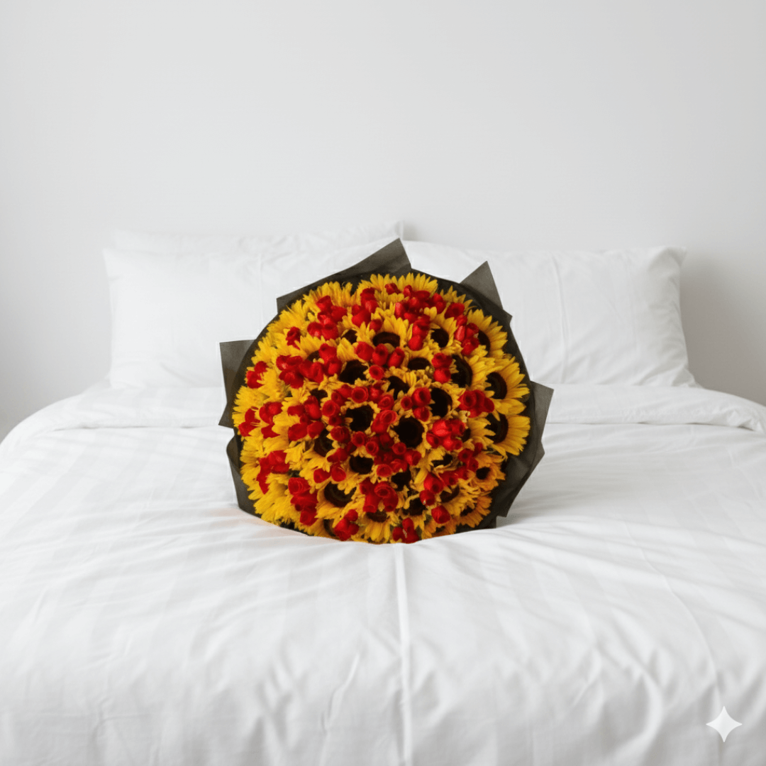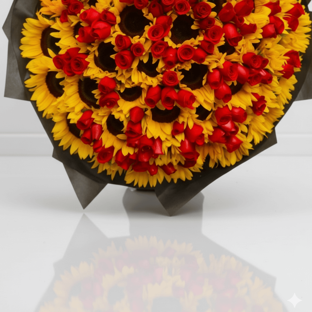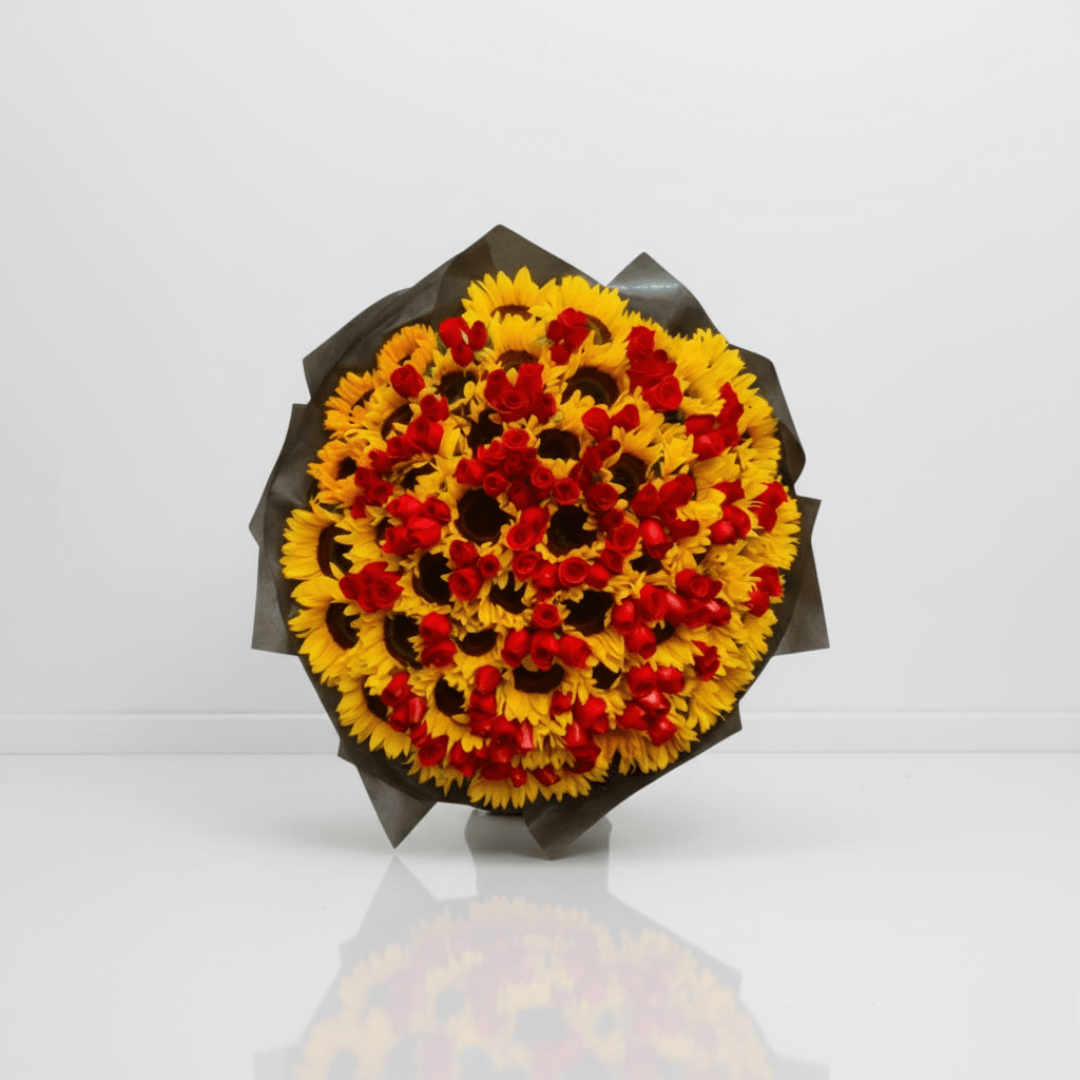 Ramo de 100 rosas y 50 girasoles. Una combinación majestuosa de pasión y energía. Celebra el amor y la felicidad con un arreglo inolvidable.