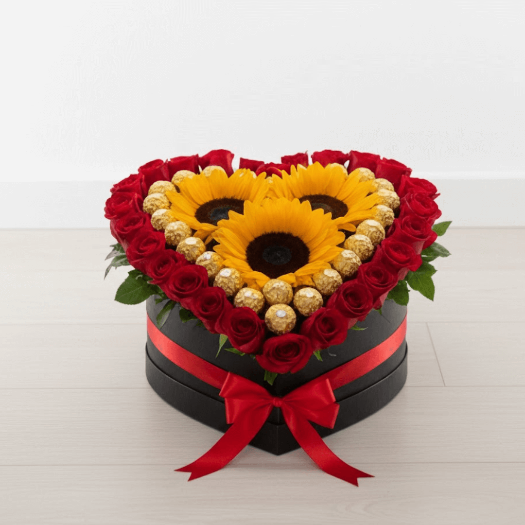 Arreglo en caja de corazón de 24 rosas, 24 chocolates y 3 girasoles