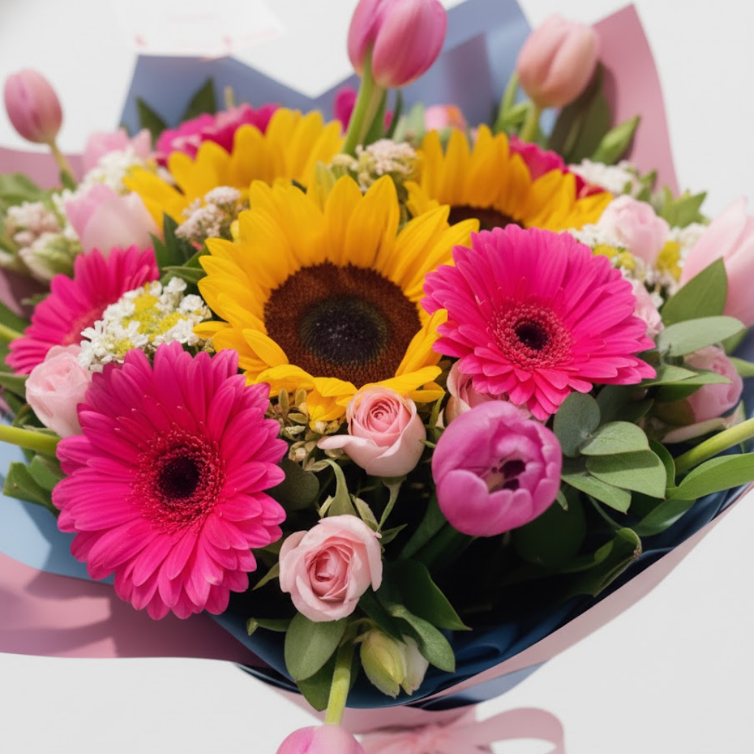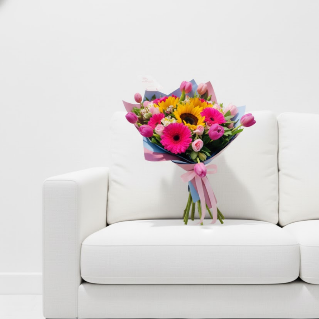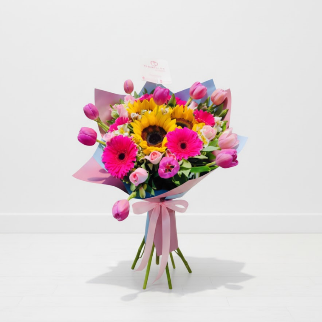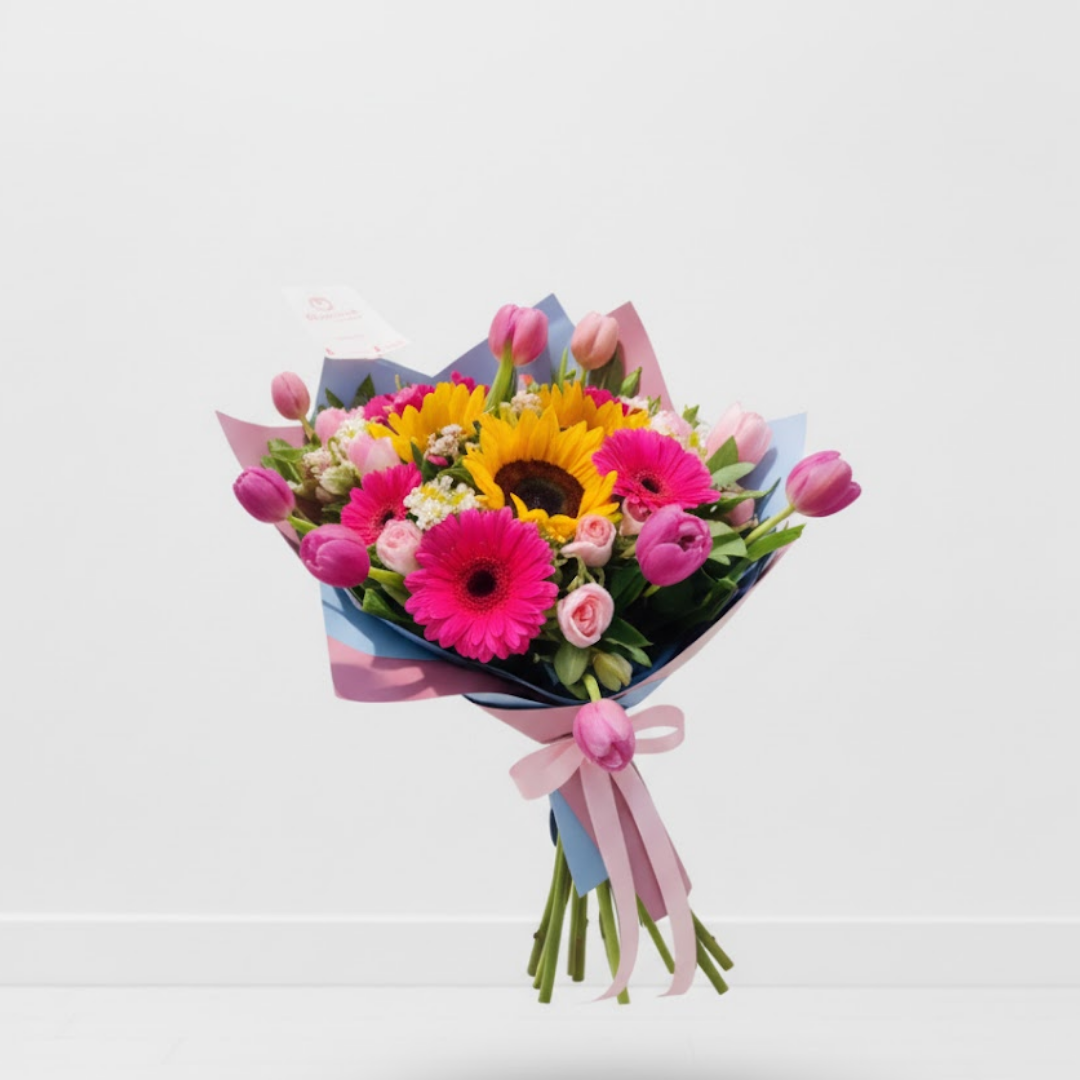 Una fusión de 3 girasoles, 12 rosas y 6 gerberas en un diseño cálido y armonioso. El regalo ideal para iluminar el día de esa persona especial.