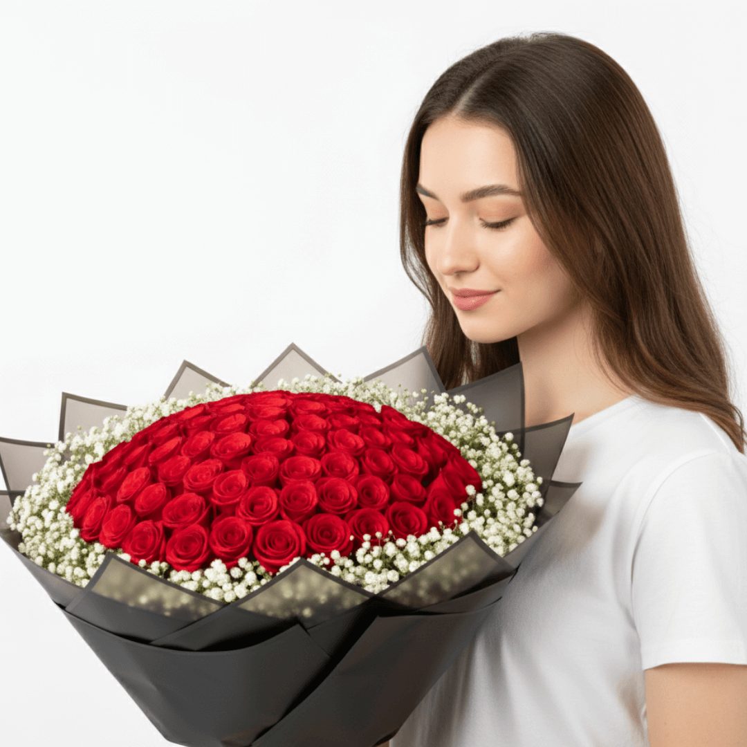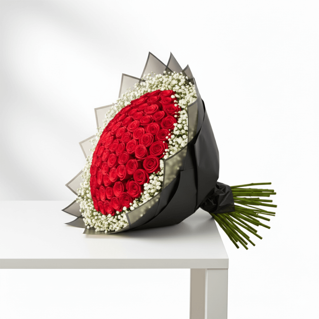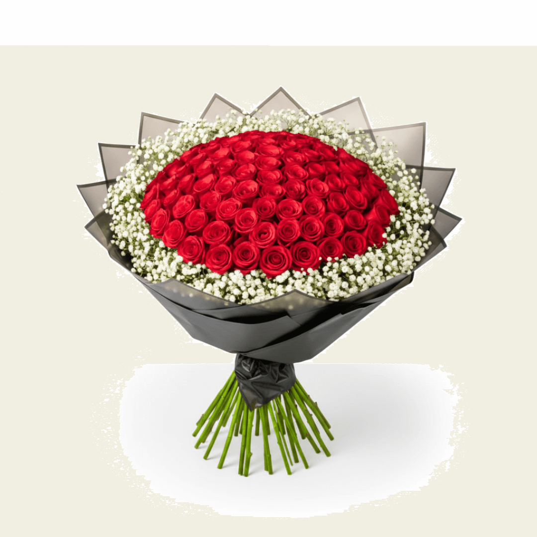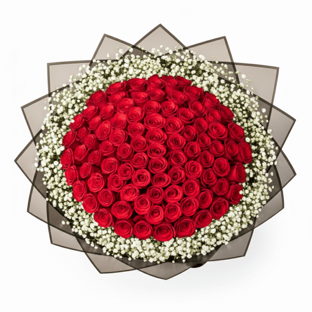 Ramo de 100 rosas y gypsophilia blanca, diseñado para expresar sentimientos sinceros con clase. Perfecto para bodas, cumpleaños o momentos especiales.