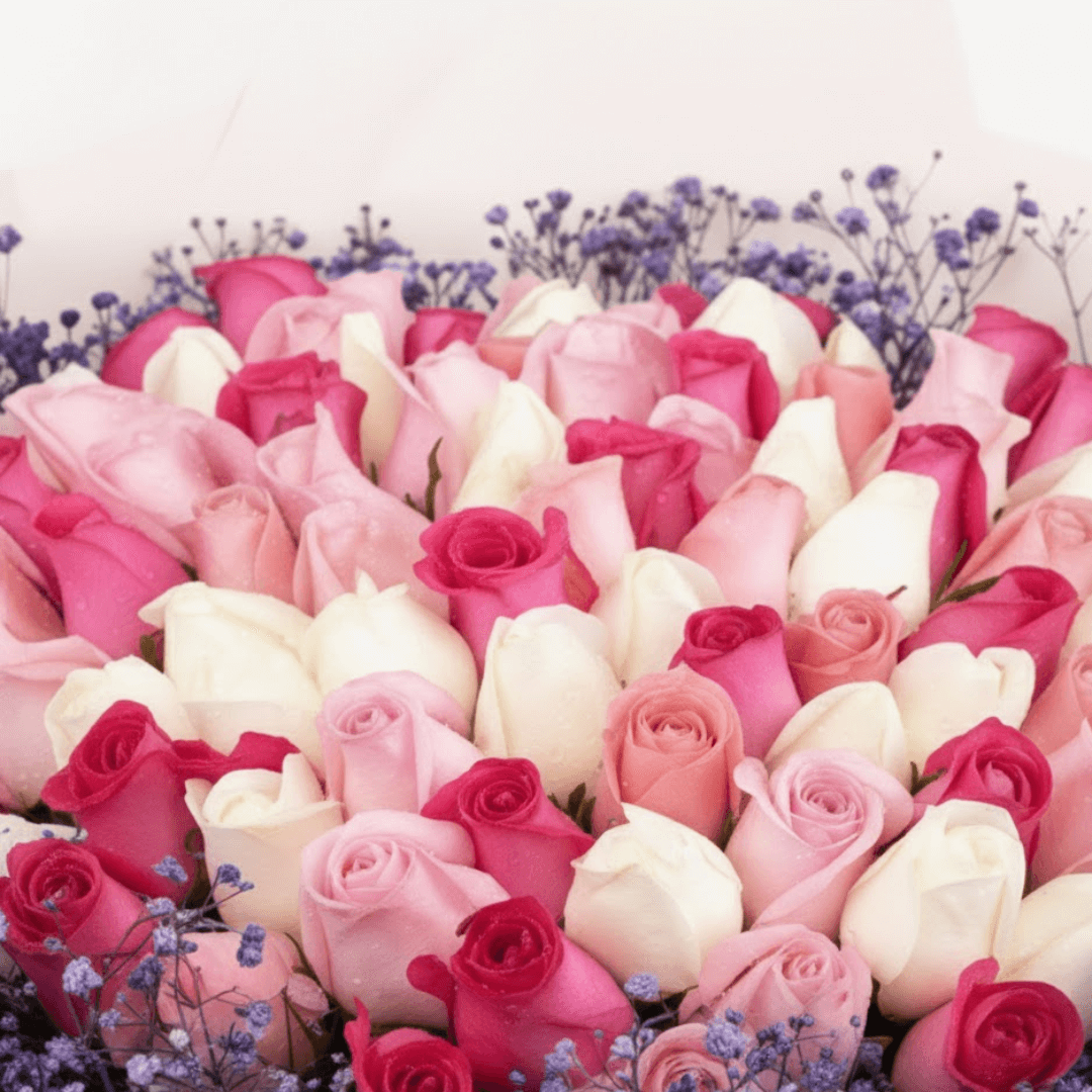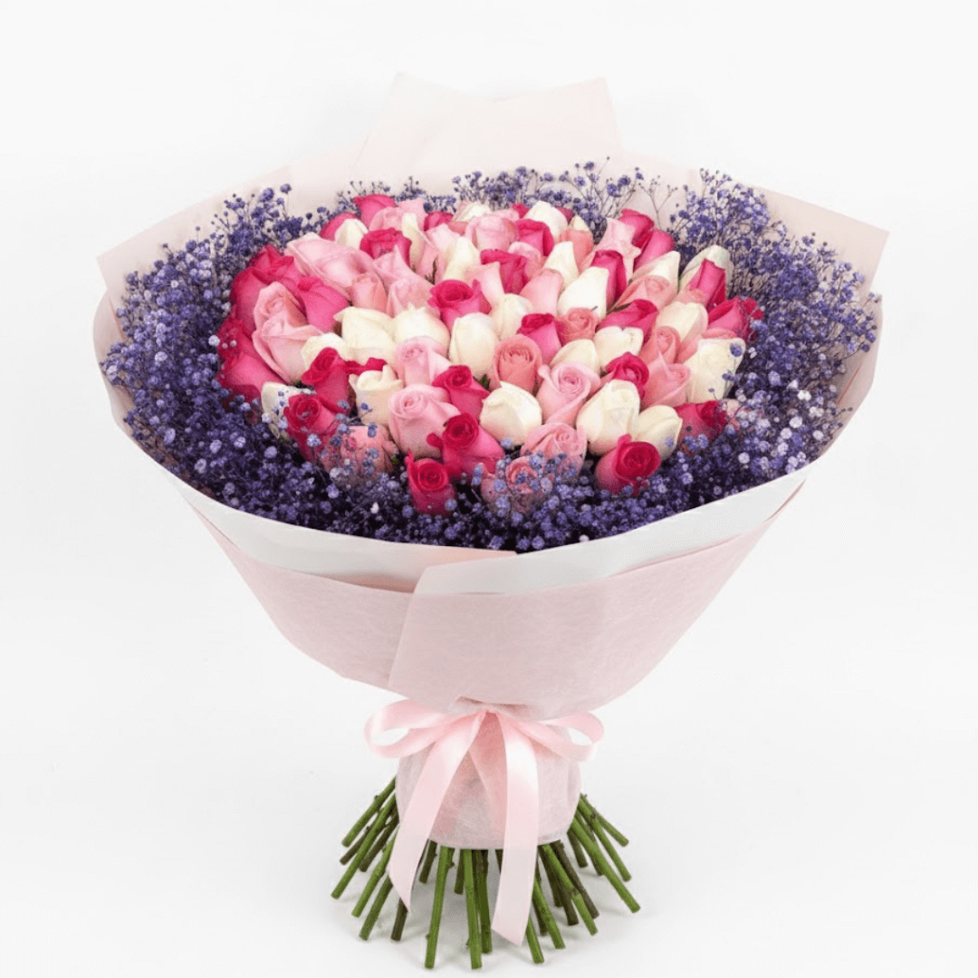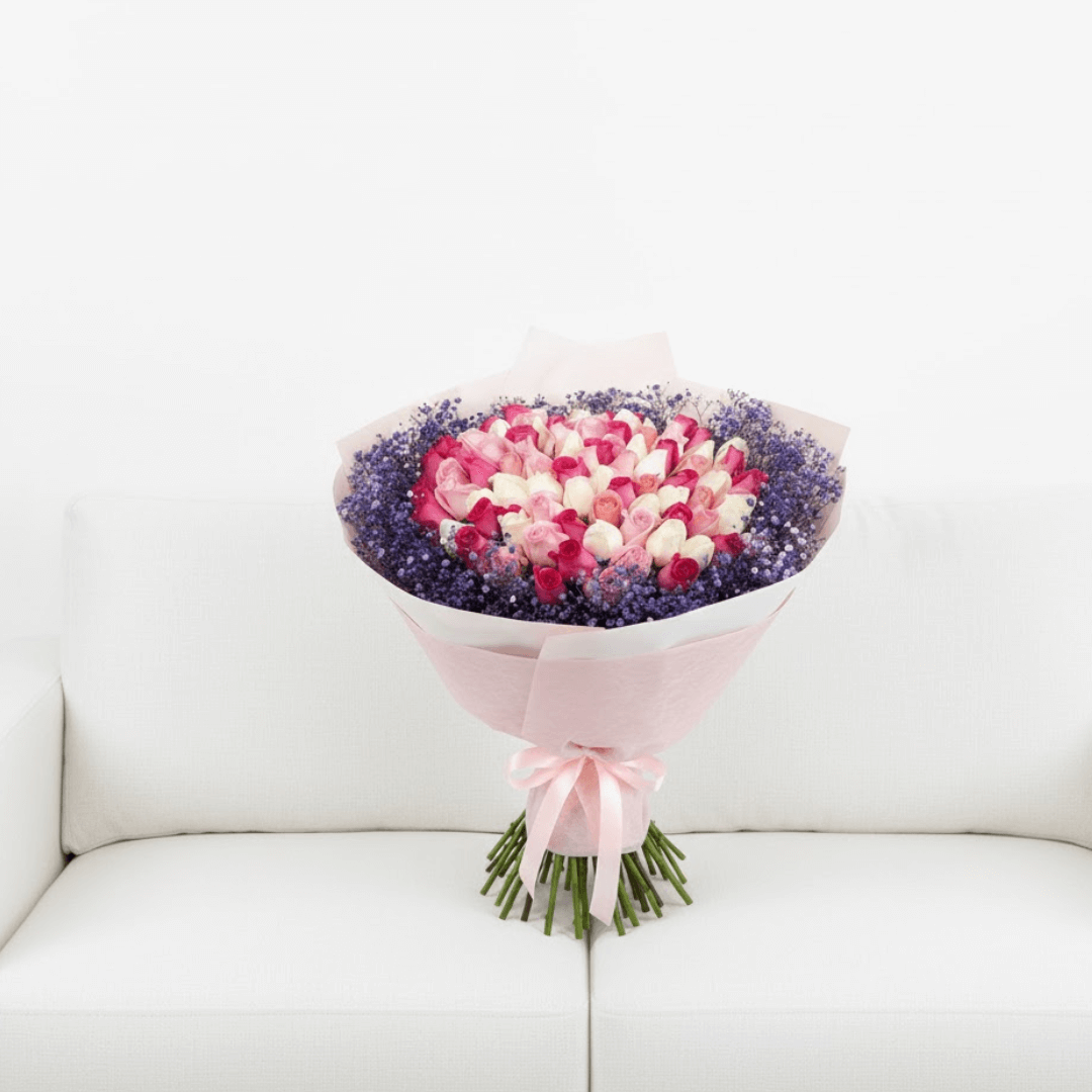 Impacta con nuestro exquisito ramo de 100 rosas vibrantes, elegantemente envuelto con follaje morado teñido. Un regalo majestuoso para cualquier ocasión. ¡Añade extras y recibe con nuestro servicio de entrega a domicilio!