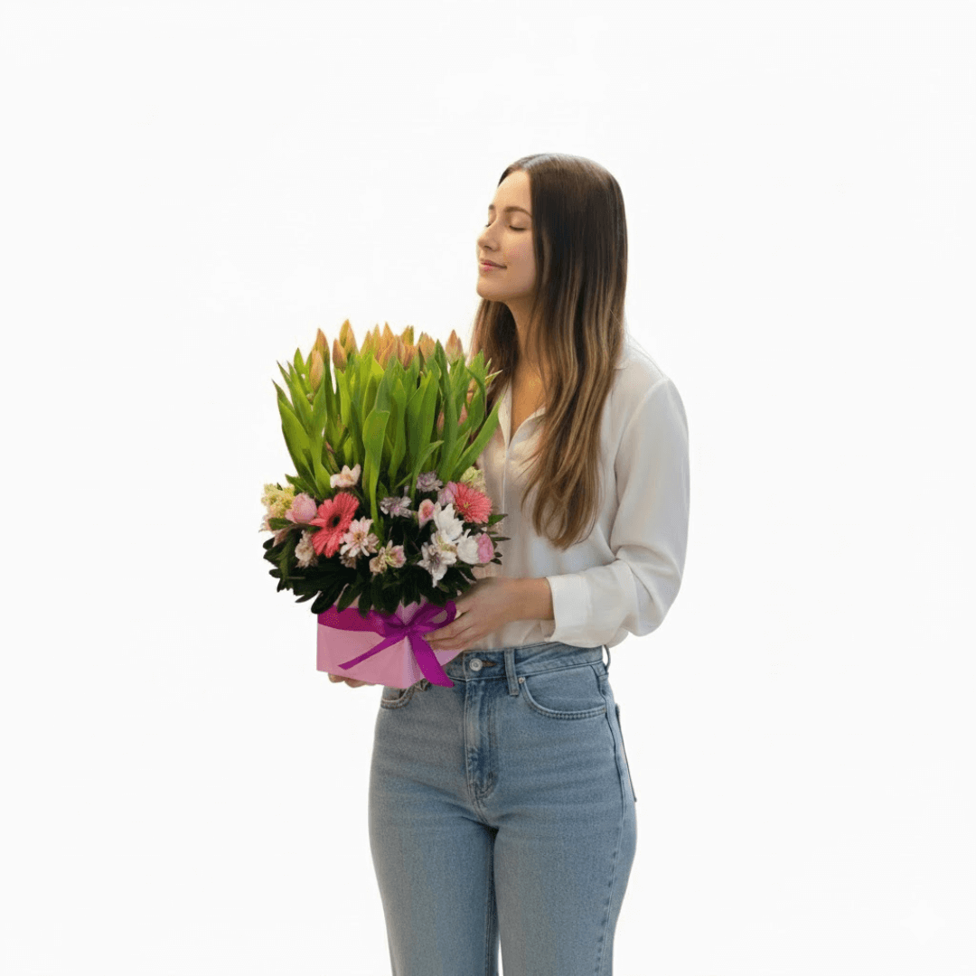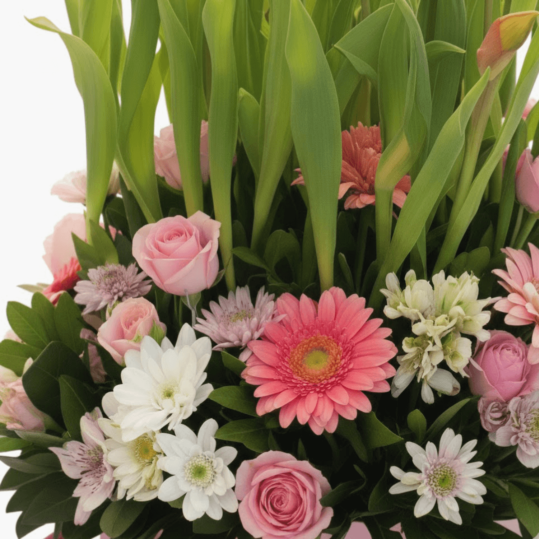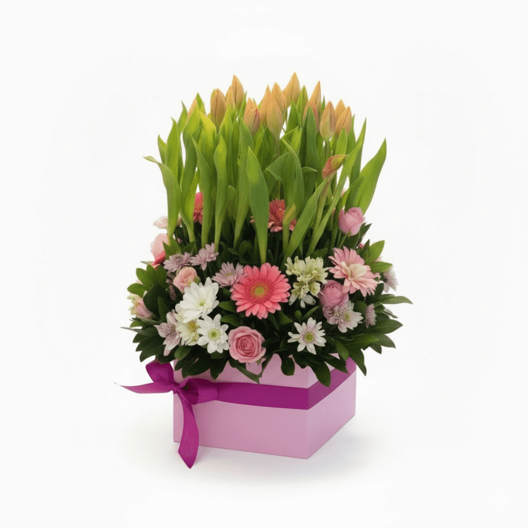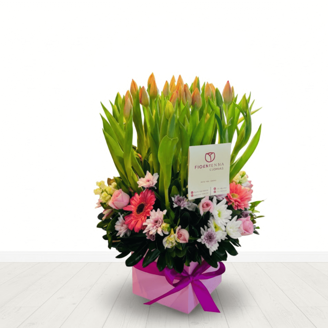 Celebra el amor y la alegría con este arreglo de 30 tulipanes, margaritas, gerberas y rosas. Una mezcla vibrante de tonos y texturas que expresan sentimientos genuinos con elegancia y estilo premium.