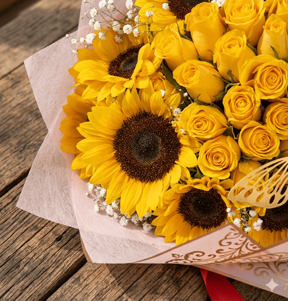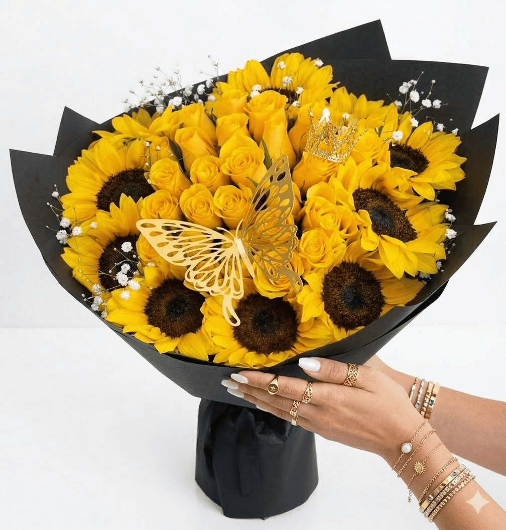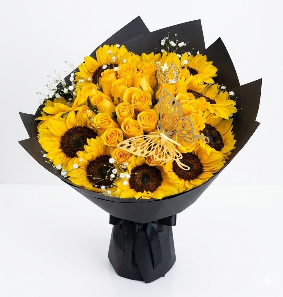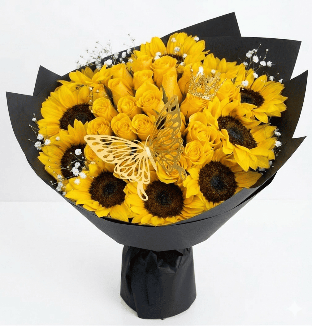 ¿Buscas un detalle que defina la palabra exclusividad? Nuestro Ramo de 24 Rosas Amarillas con 10 Girasoles es una pieza de alta gama diseñada para quienes merecen lo mejor. No es solo un arreglo floral; es una declaración de prestigio que combina la energÃa del amarillo con accesorios de lujo, como una corona chica y una mariposa decorativa, creando un impacto visual de alta fidelidad que nadie podrá ignorar.