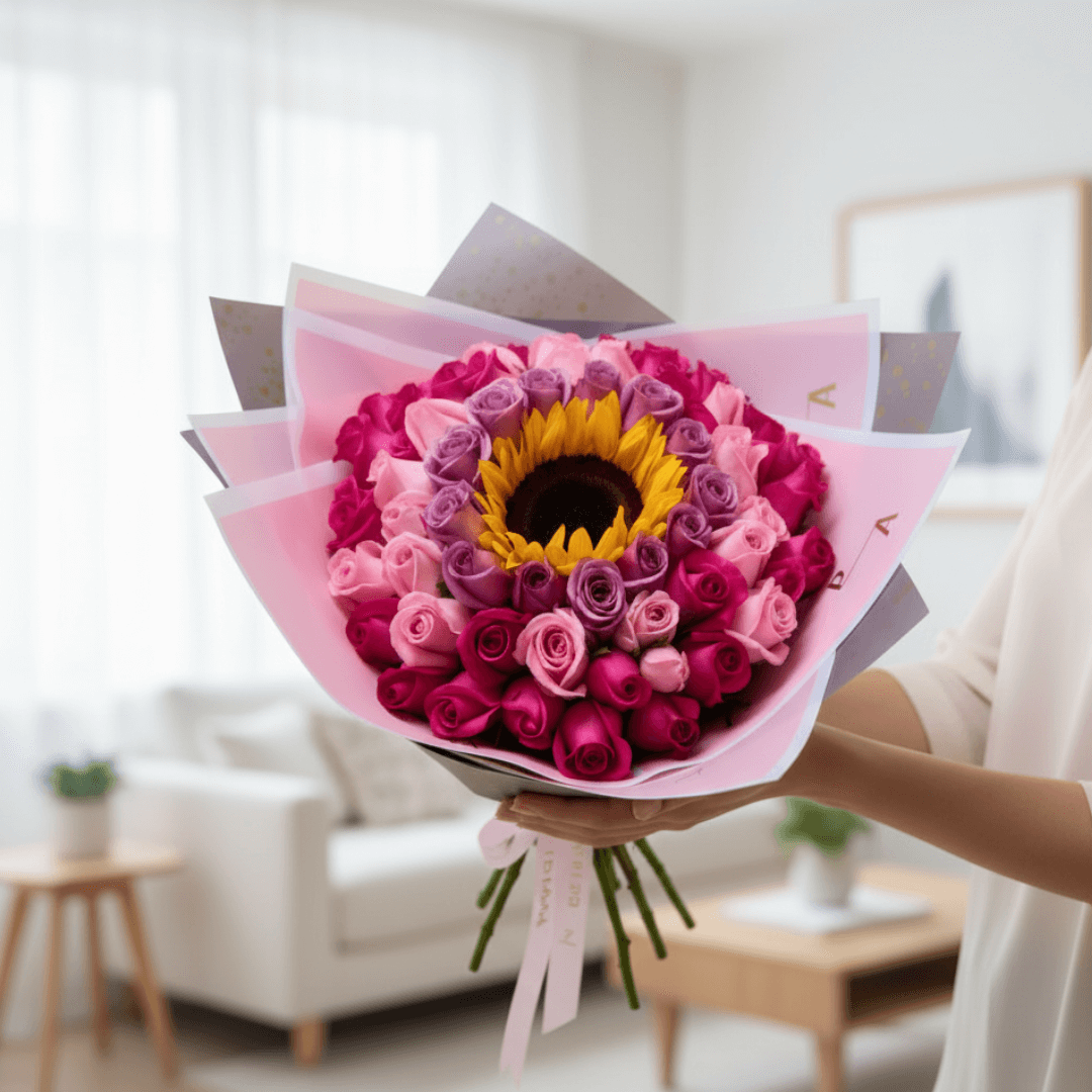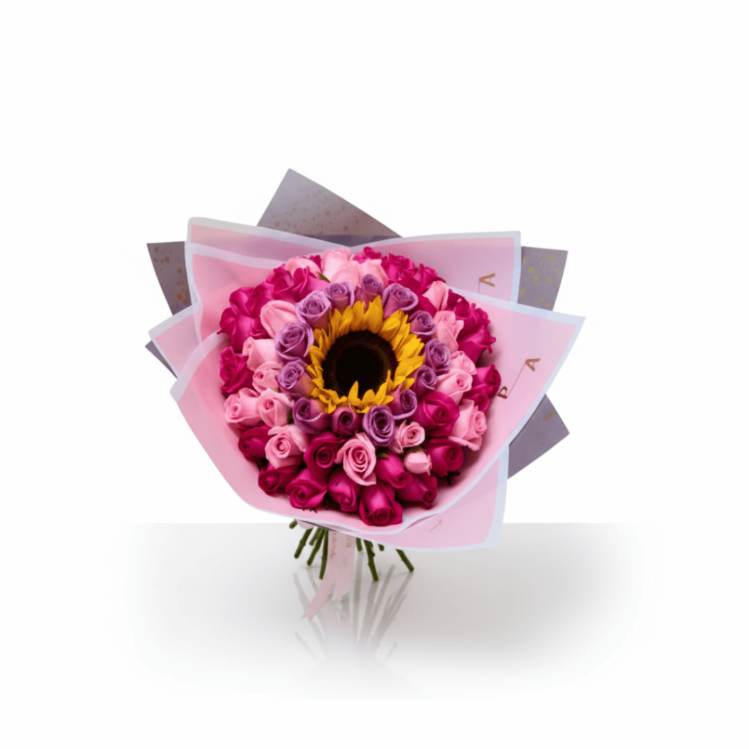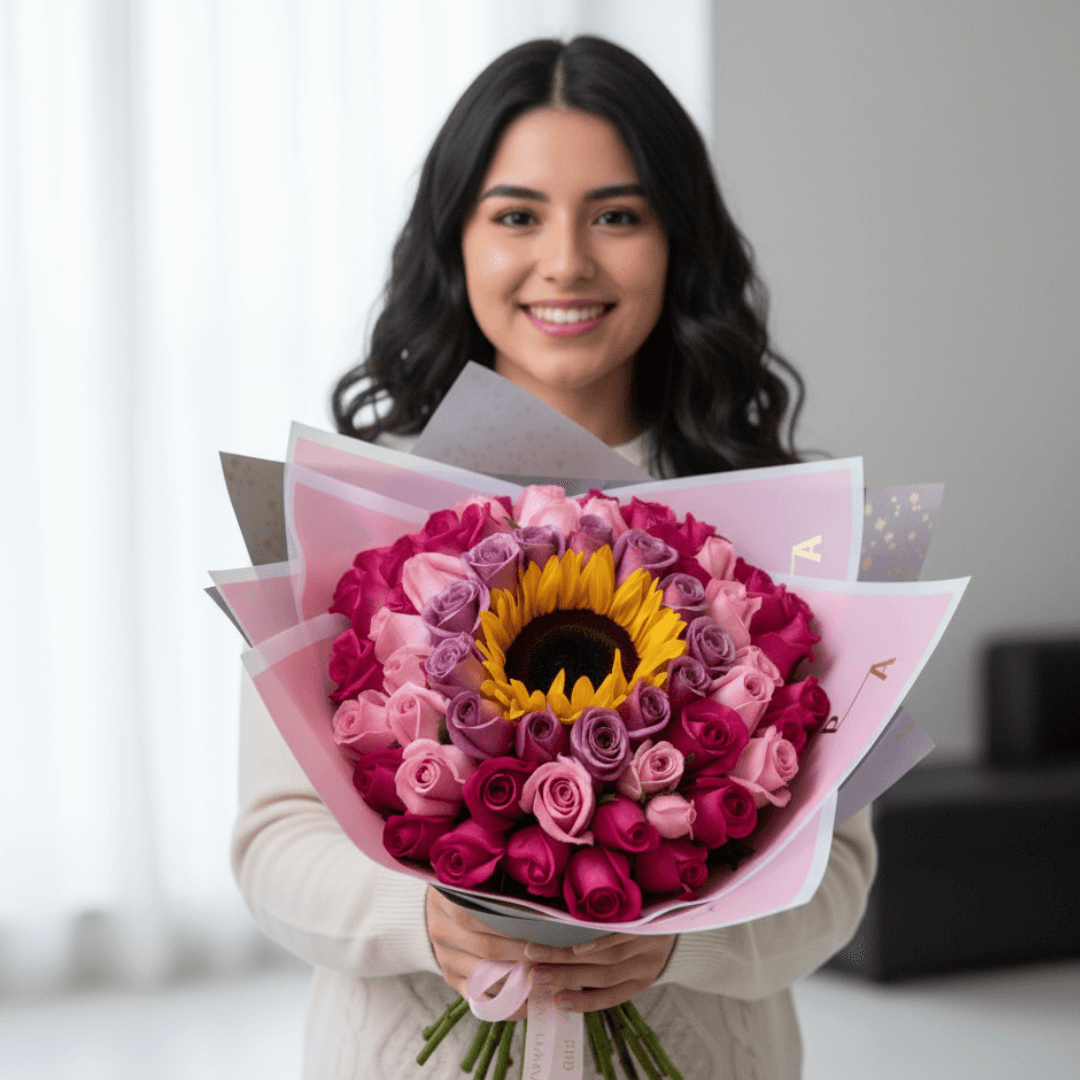 Ramo de 50 rosas y 1 girasol, ideal para XV años o cumpleaños. Su contraste vibrante irradia energía positiva y belleza natural.