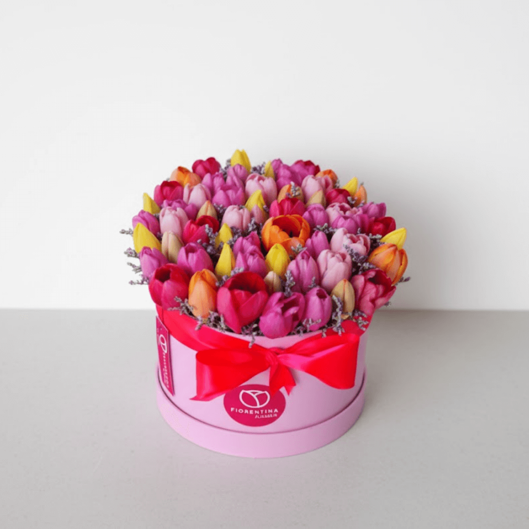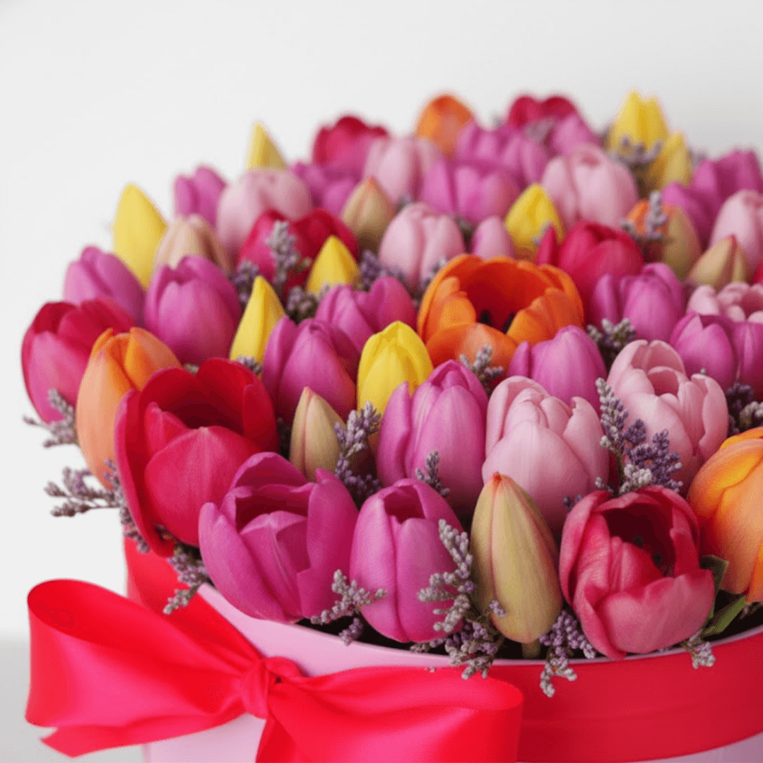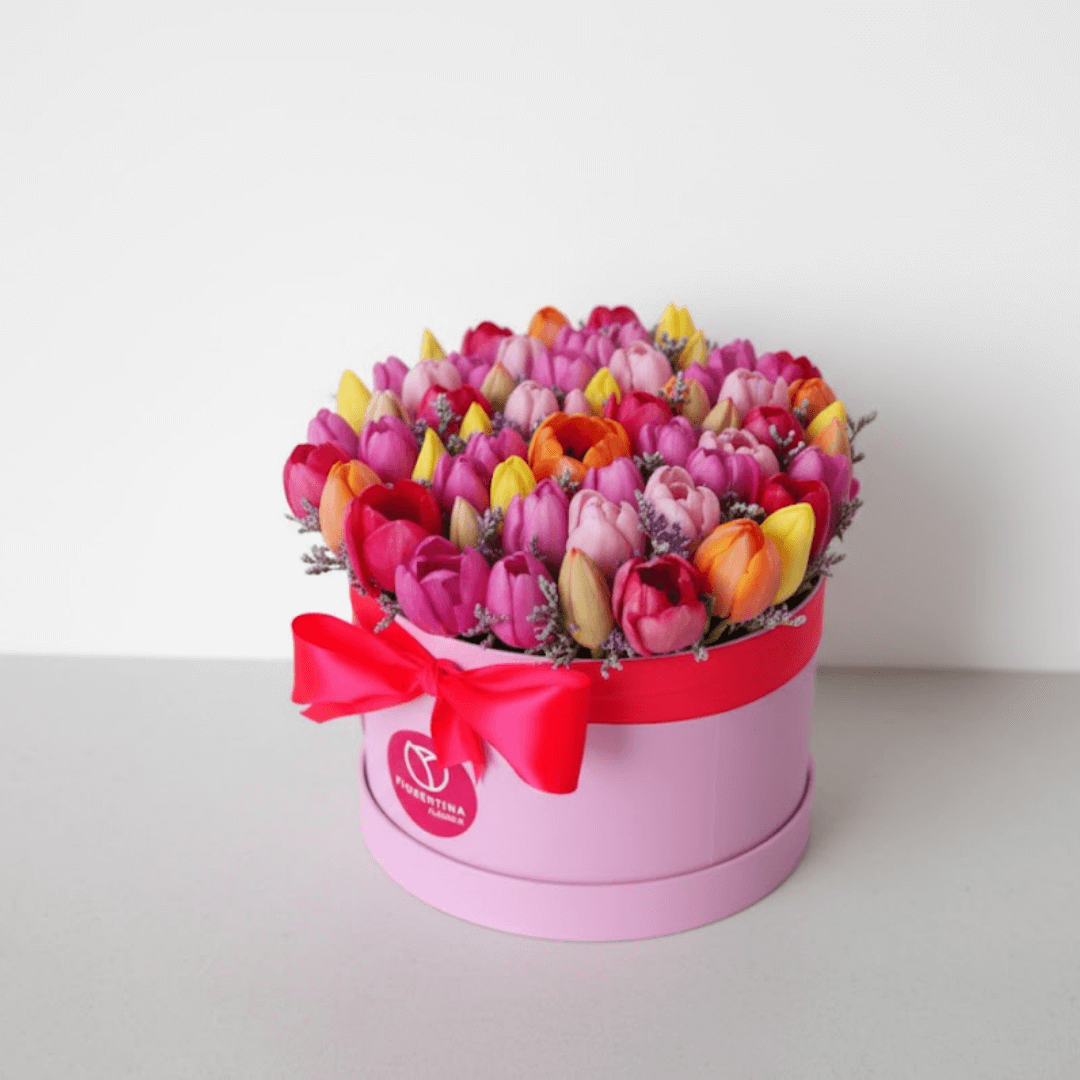 Déjate enamorar por este arreglo en caja con 50 tulipanes frescos. Su diseño moderno y sofisticado representa delicadeza y distinción, ideal para sorprender a alguien especial.