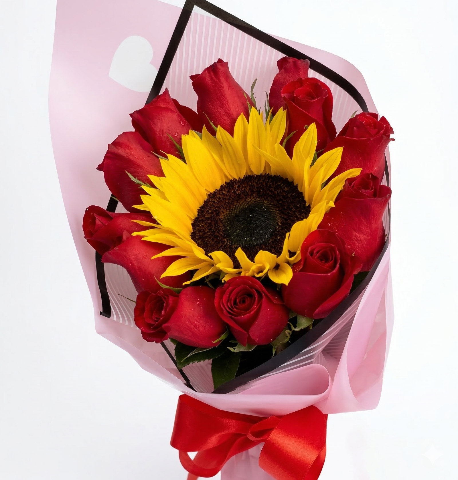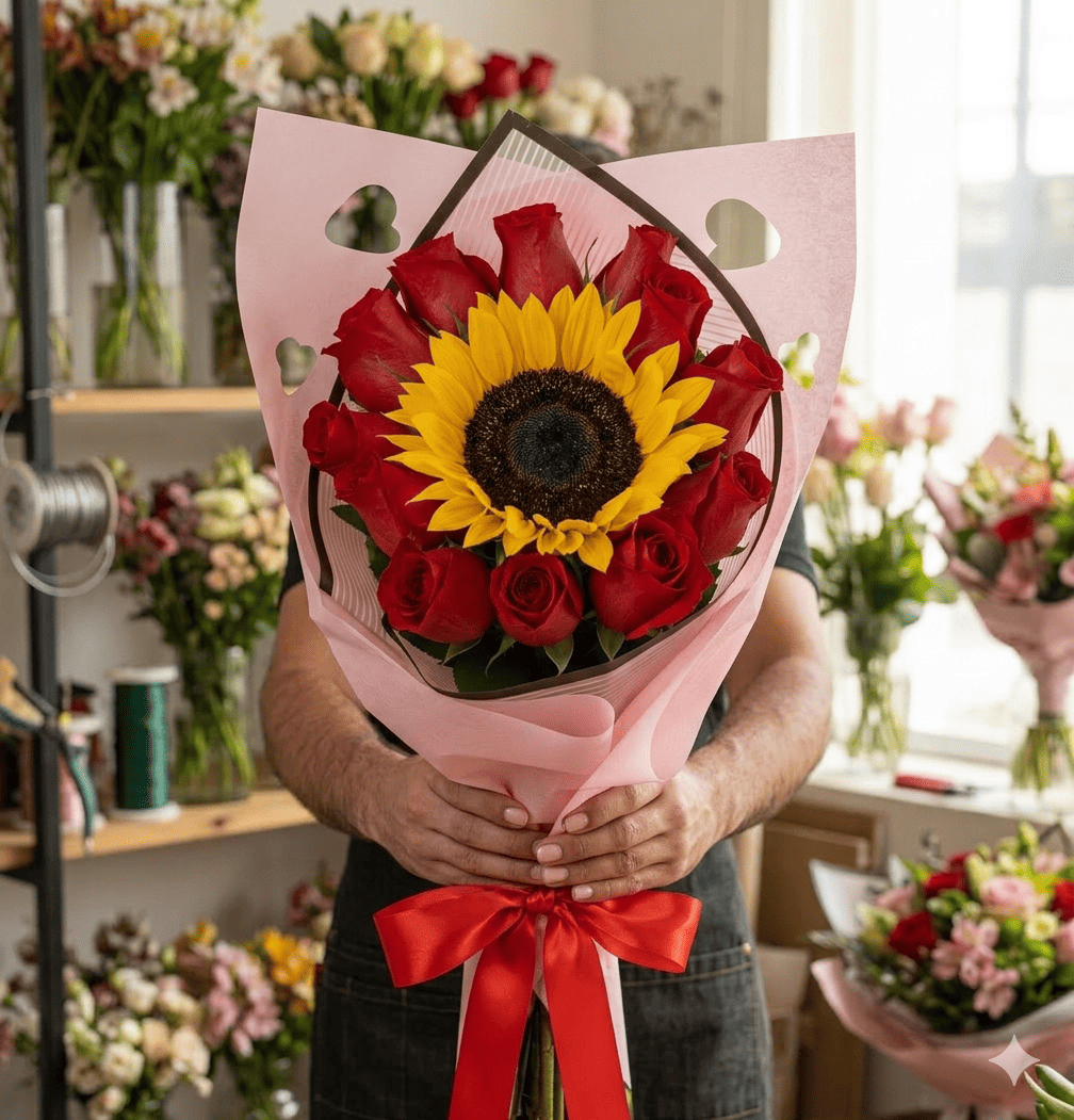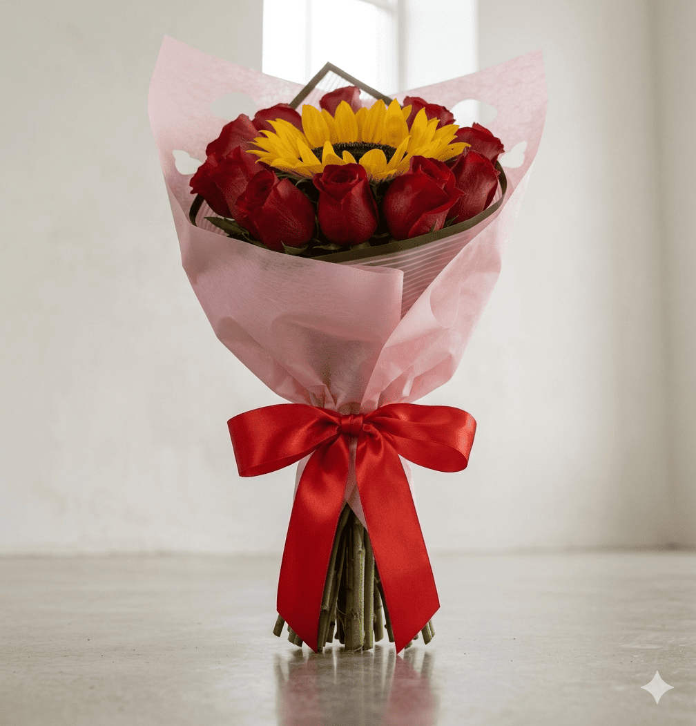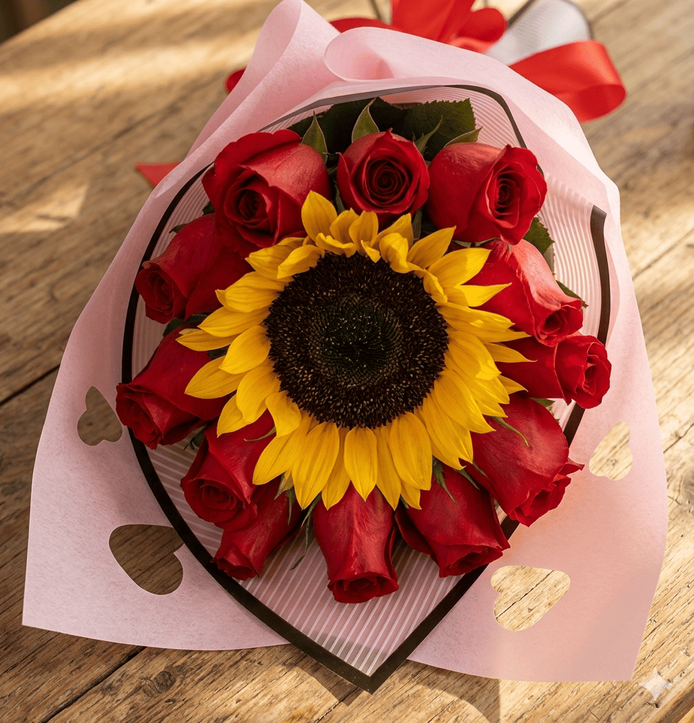 ¿Quieres regalar algo que transmita amor y alegrÃa al mismo tiempo? El Ramo de 12 Rosas y 1 Girasol es la combinación maestra de la floristerÃa moderna. Este diseño exclusivo rompe con lo tradicional al colocar un vibrante girasol en el corazón de una docena de rosas premium, creando un contraste visual impactante que simboliza que esa persona especial es el sol que ilumina tu mundo. Cada detalle cuenta para crear una experiencia completa que recordarán por siempre.