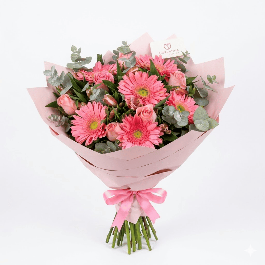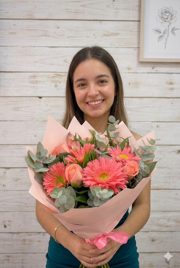 Un ramo lleno de suavidad y calidez que combina tonos delicados con una composición armoniosa. Este arreglo integra seis gerberas en color durazno, que aportan un aire cálido y sutil, junto con seis gerberas rosas que suman un toque femenino y alegre.