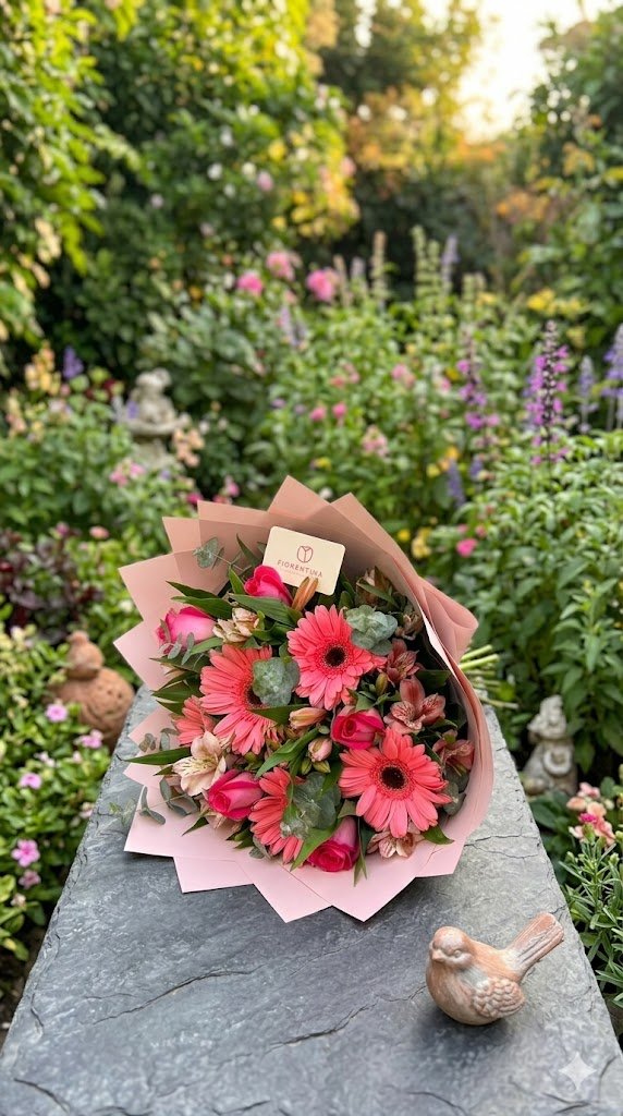 Se complementa con 10 tallos de astromelias, acompañadas de clavo y follaje de dólar, que brindan volumen, textura y un equilibrio natural sofisticado. La combinación de colores crea una pieza visualmente encantadora, perfecta para transmitir ternura, cercanía y buenos momentos.