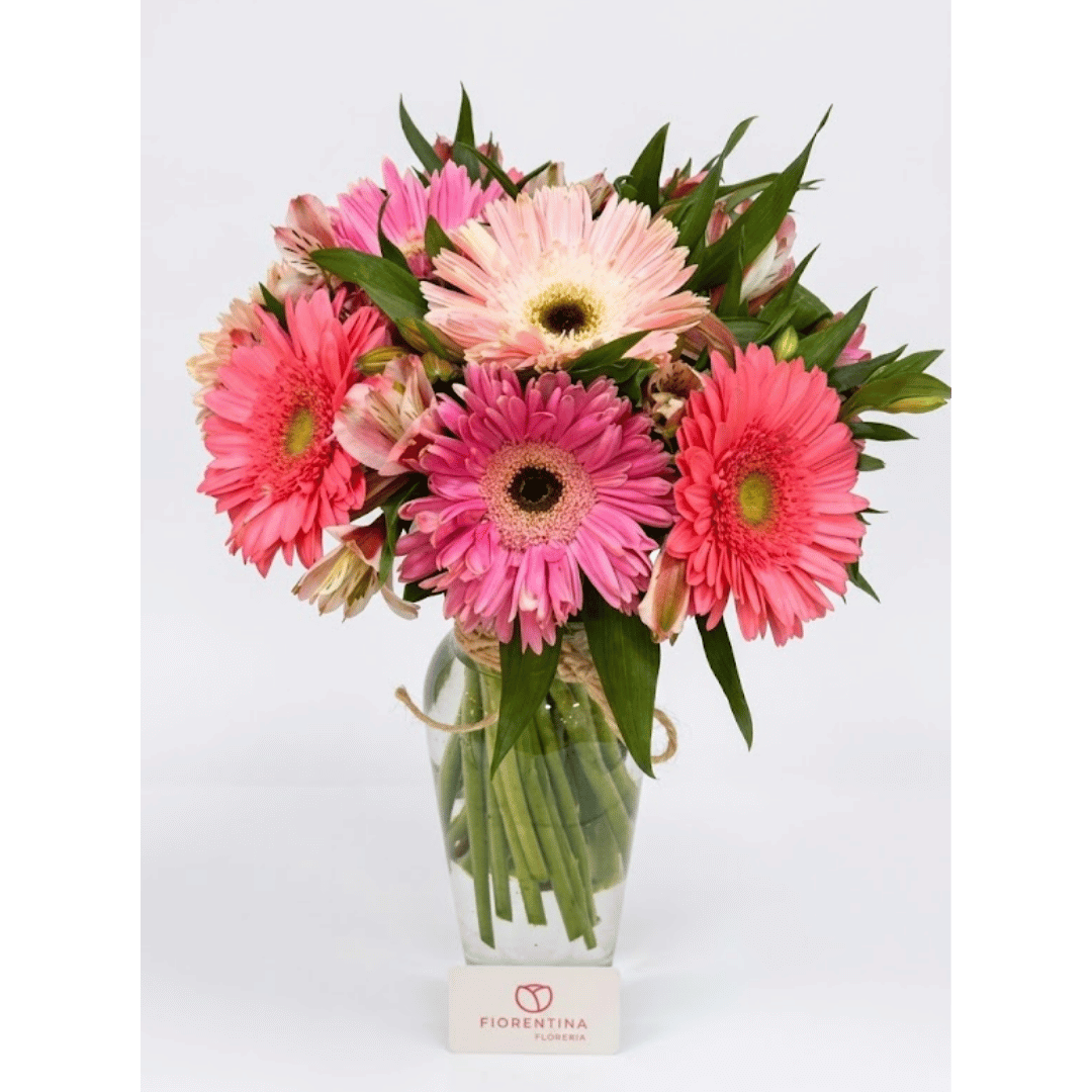 Un arreglo delicado que celebra la suavidad y la frescura en cada detalle. Este jarrón tibor chico presenta una composición armoniosa con dos gerberas en distintas tonalidades de rosa, que aportan un toque femenino, alegre y lleno de vida.
