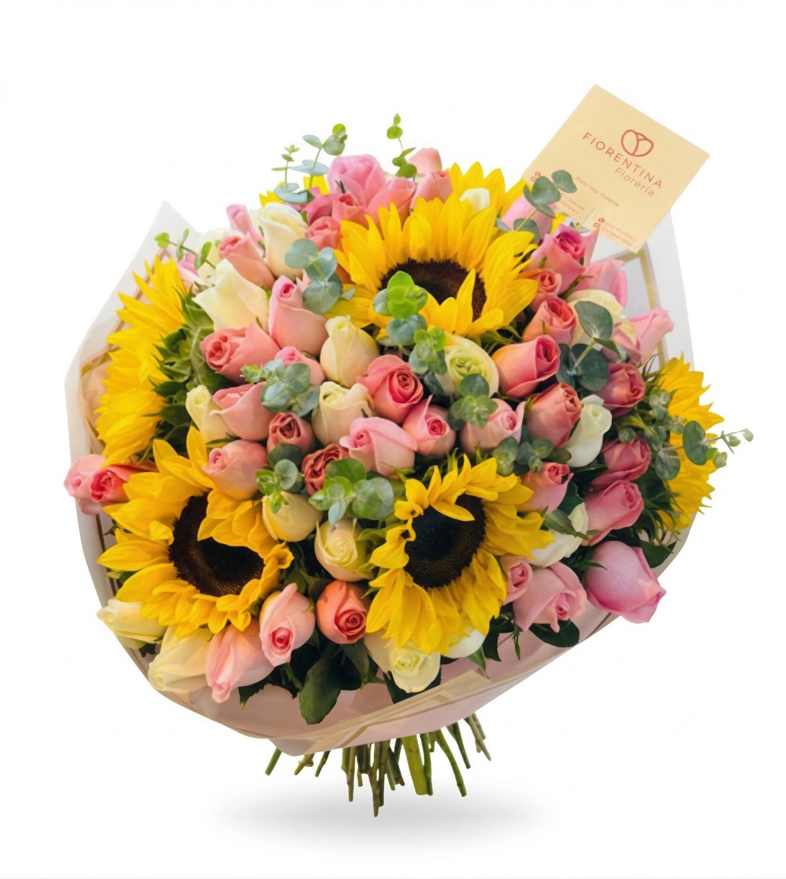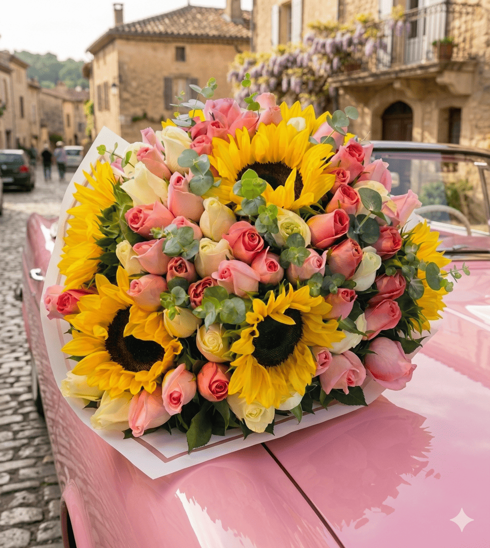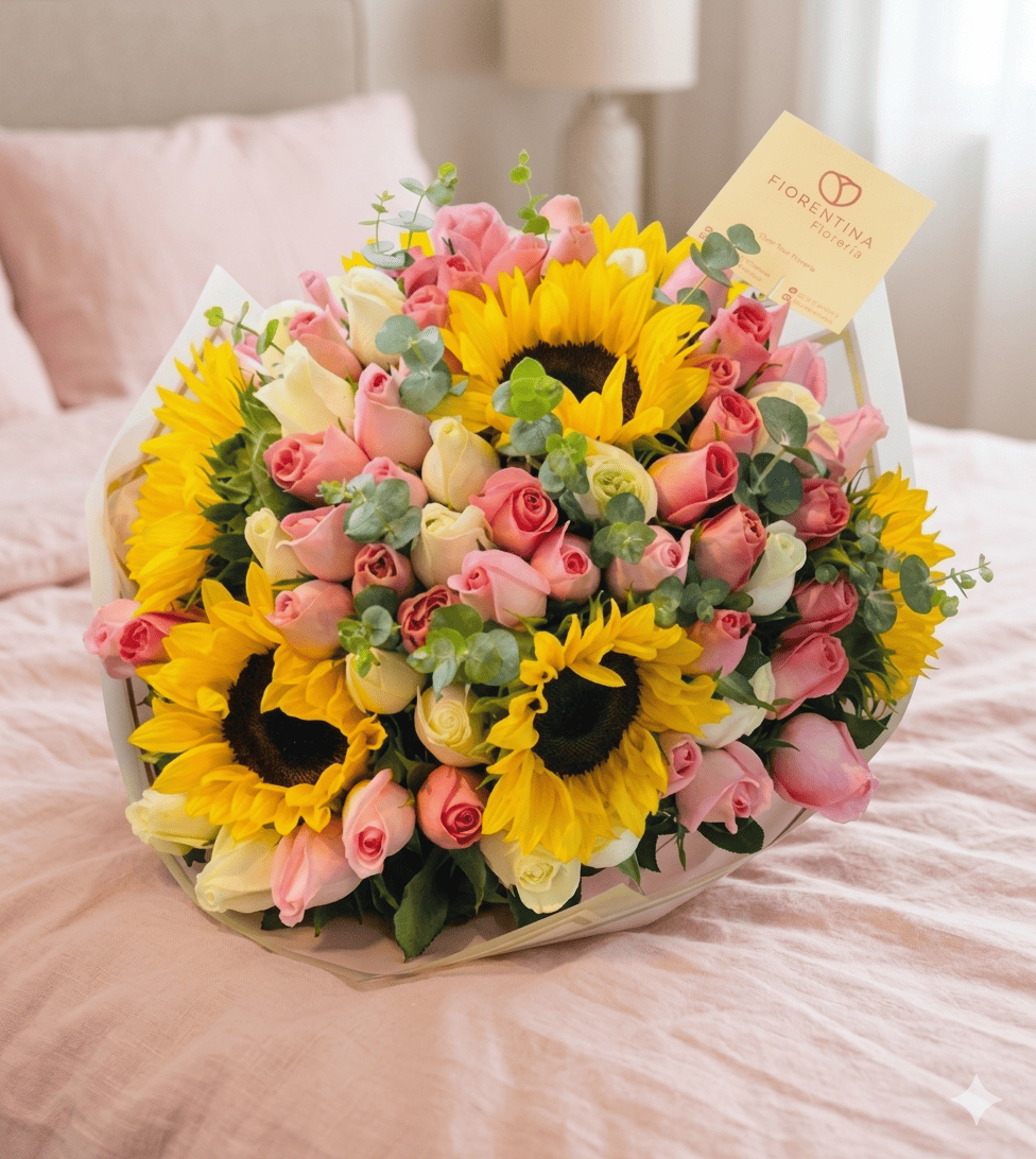 ¿Estás buscando el regalo definitivo para una ocasión irrepetible? El Ramo de 75 Rosas y 7 Girasoles es una obra maestra de la alta floristería, diseñada para quienes desean hacer una declaración de admiración y éxito sin precedentes. Este arreglo monumental fusiona la delicadeza de casi cien rosas premium con la fuerza vibrante de siete girasoles gigantes, creando un impacto visual de lujo absoluto que domina cualquier espacio.