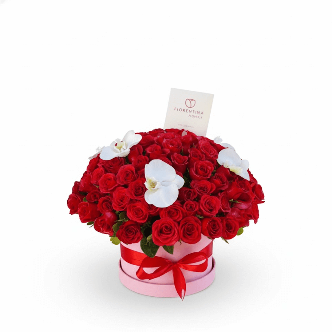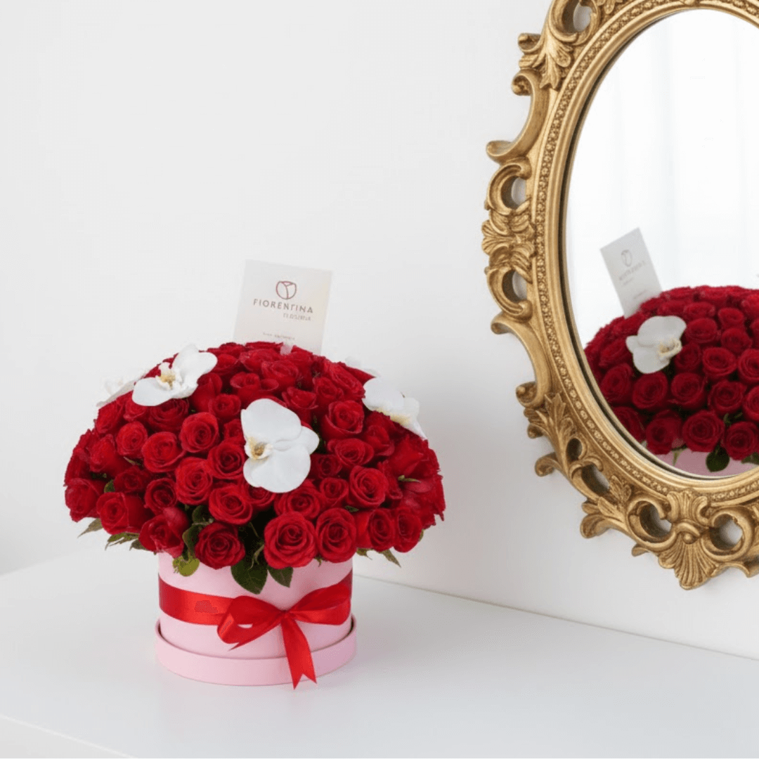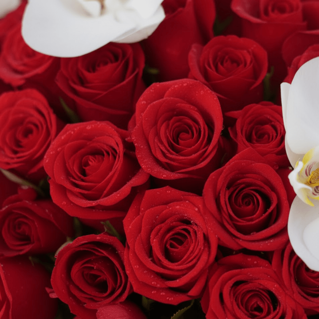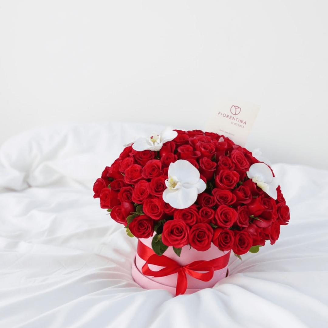 Arreglo exclusivo en caja mediana con 100 rosas rojas y un toque sublime de 5 flores de orquídea. El regalo perfecto de amor y sofisticación. ¡Personaliza con extras y recibe con entrega a domicilio!