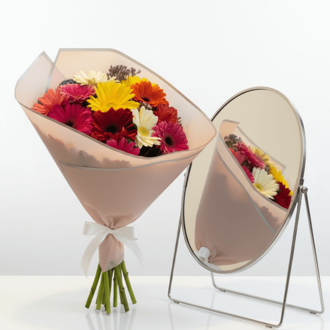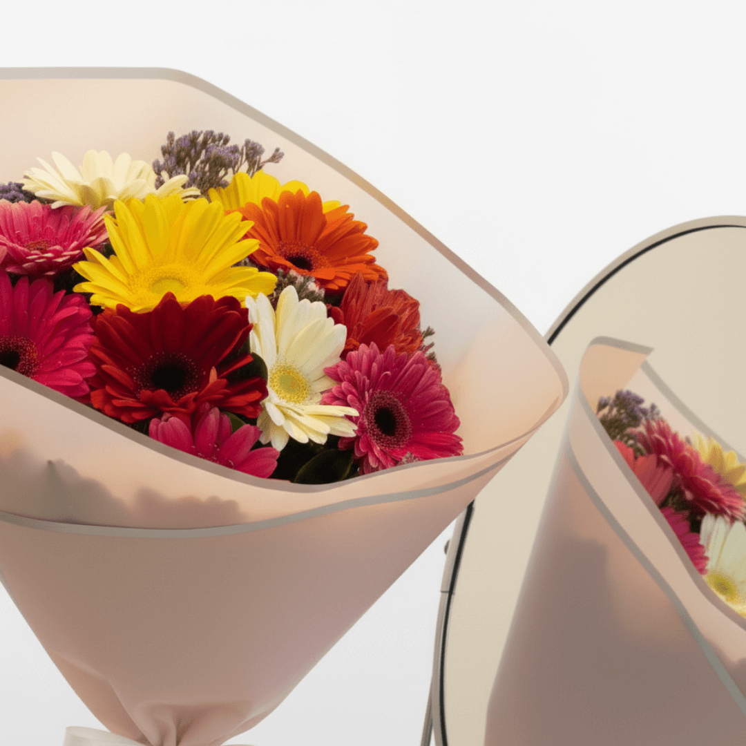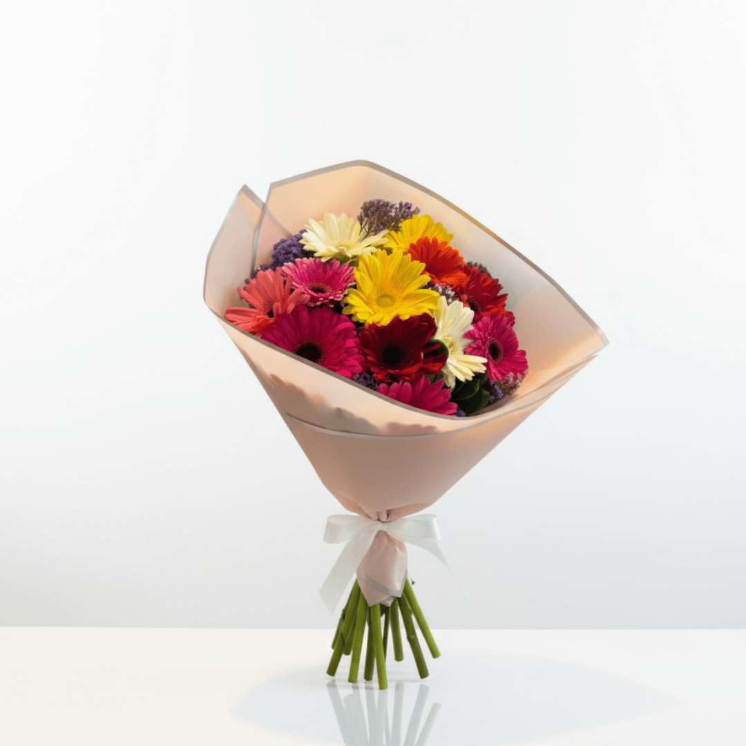 Ramo de 12 gerberas con follaje fresco. Una explosión de color y energía que ilumina cualquier ocasión. ¡Regala color, regala sonrisas!