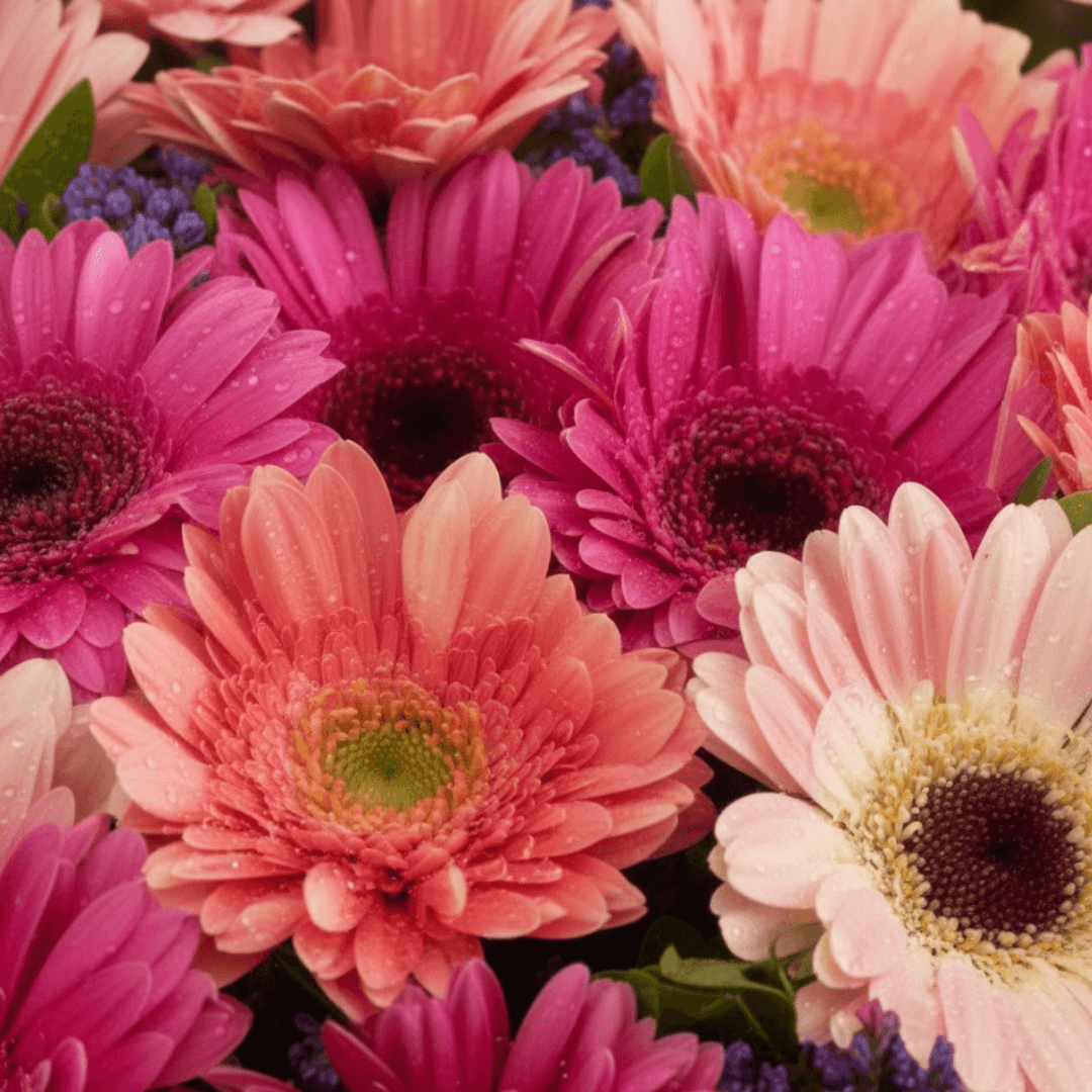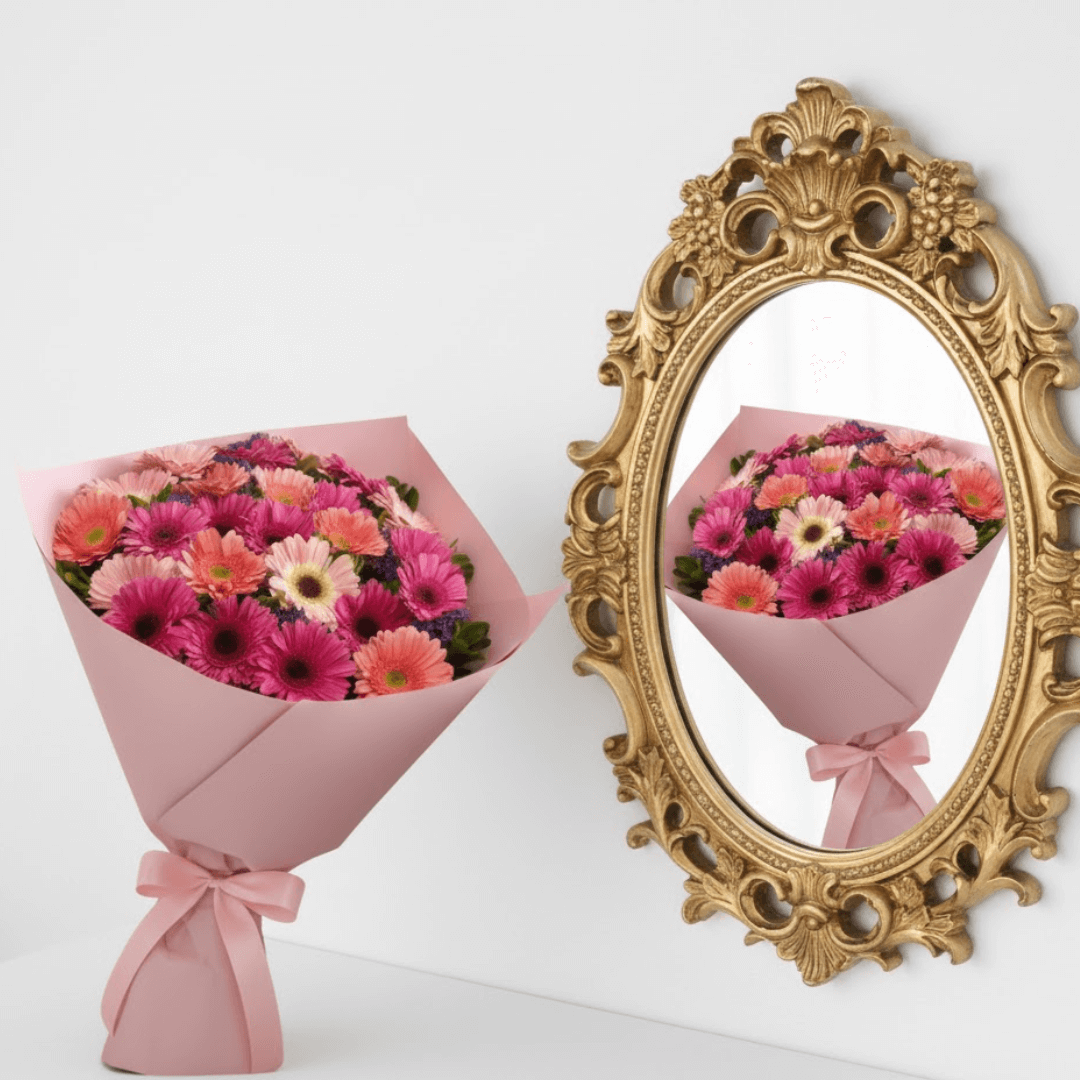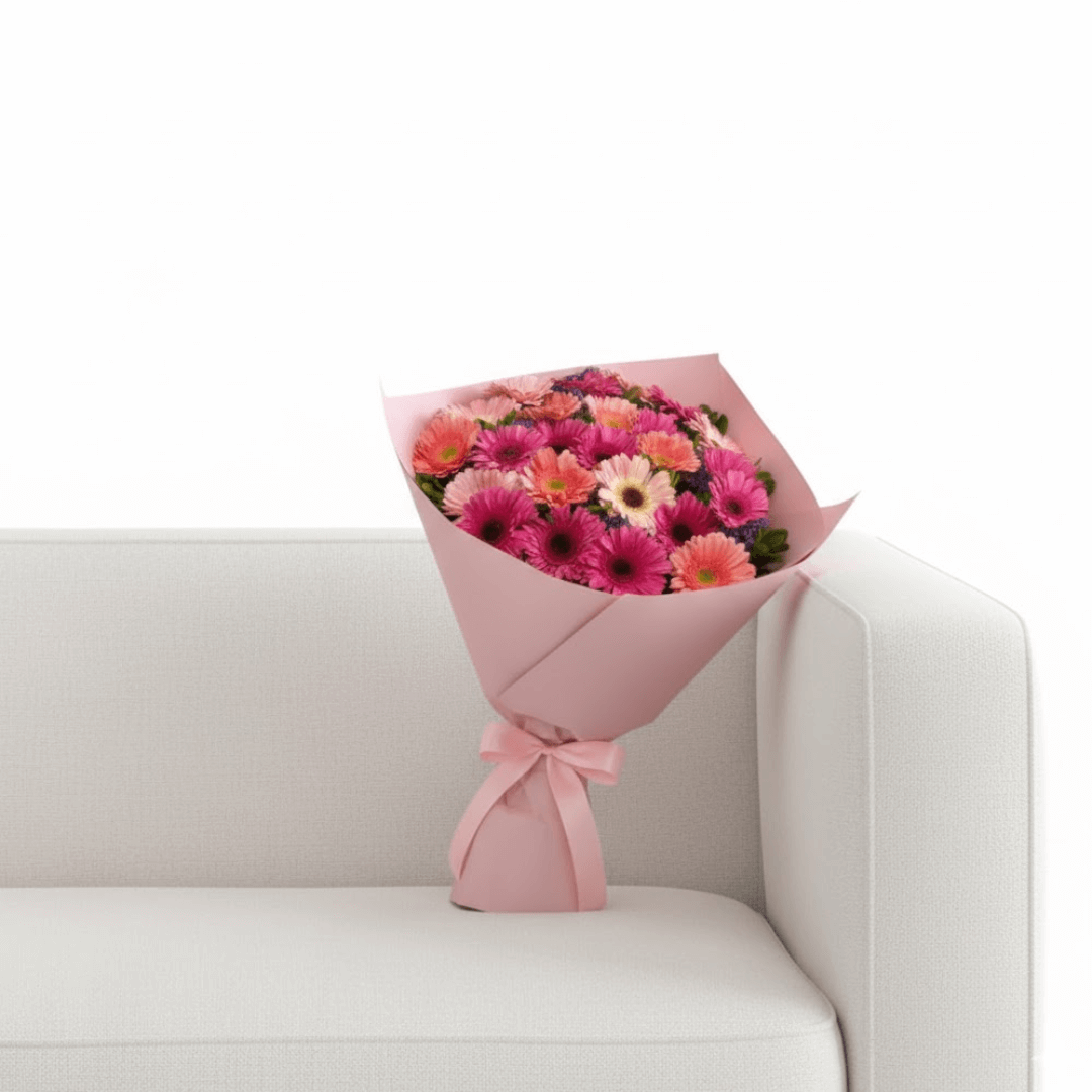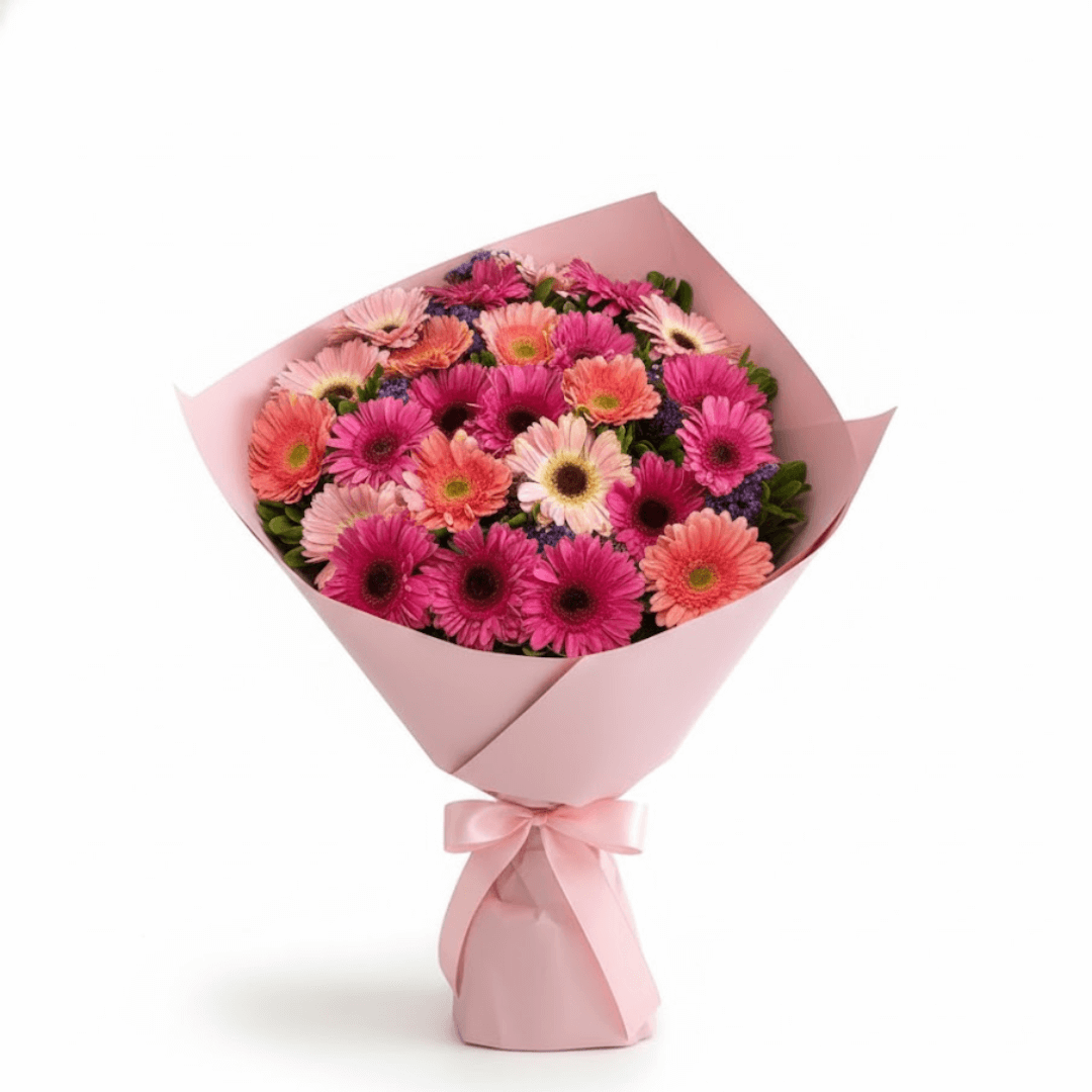 Ramo de 24 gerberas con follaje. Elegancia y frescura que encantan a primera vista. ¡Cada gerbera cuenta una historia de amor!