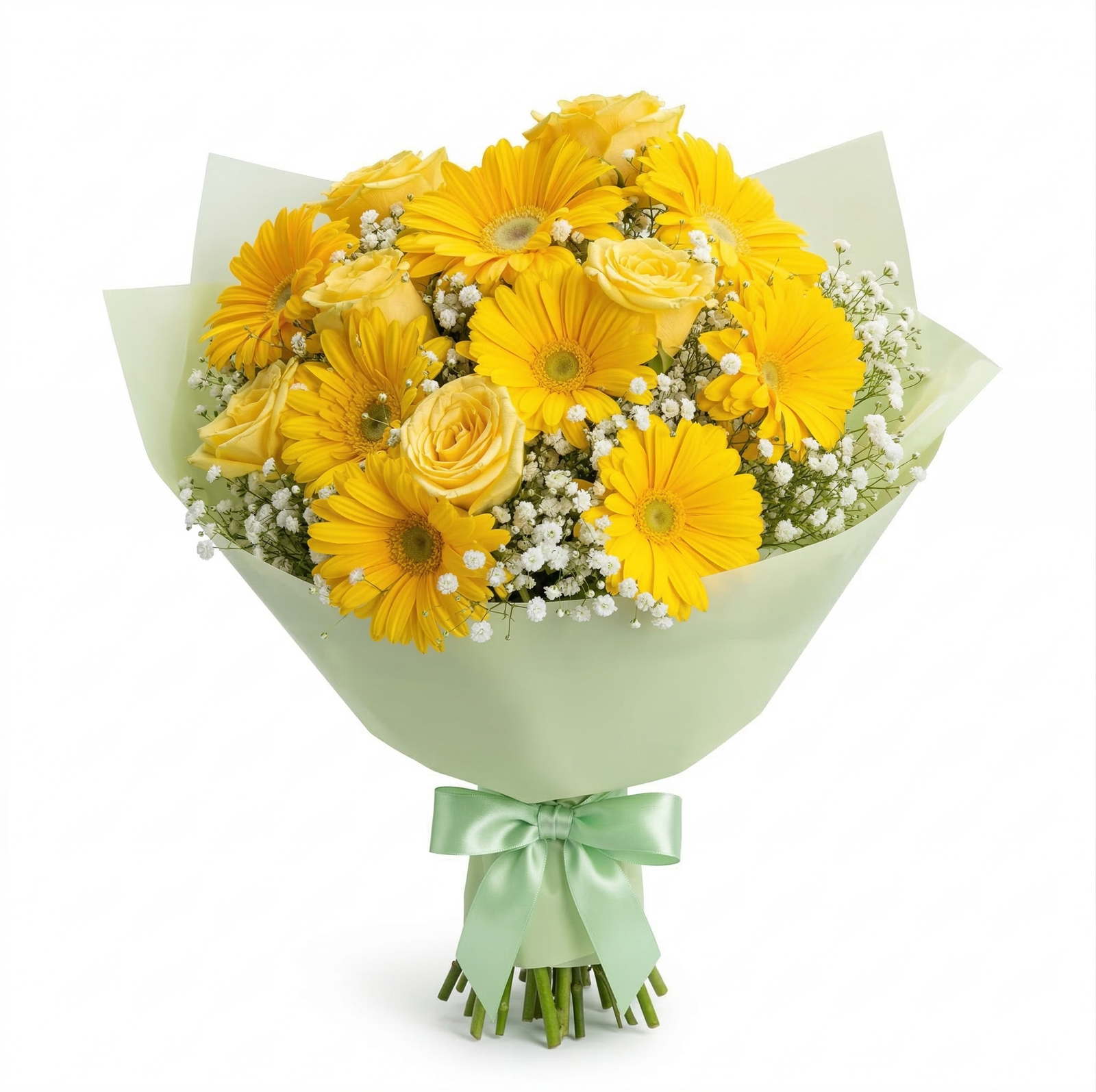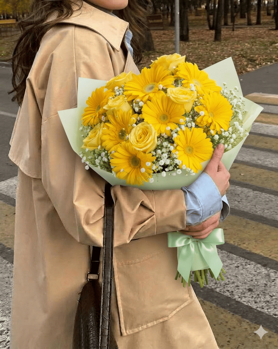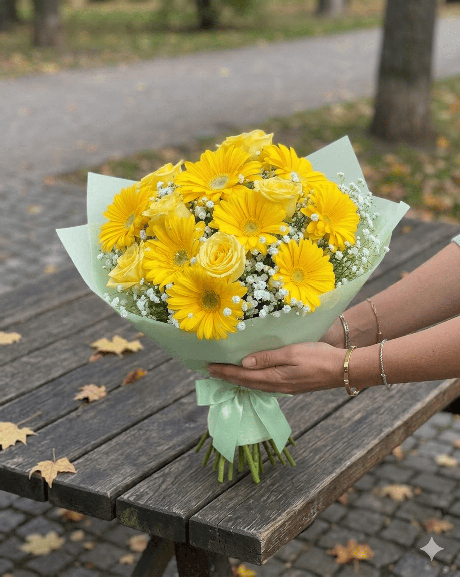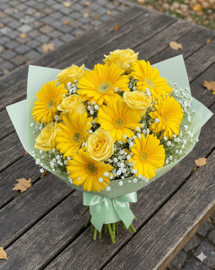 - ¿Quieres entregar una dosis de optimismo en forma de flores? El Ramo de 9 Gerberas Amarillas y 6 Rosas con Gypsophilia es una creación artÃstica que equilibra la vitalidad del campo con el refinamiento de la alta floristerÃa. Este bouquet atrapa la mirada gracias a su fascinante mezcla de dimensiones: el porte imponente de las gerberas se funde con la delicadeza de las rosas, logrando una composición de texturas ricas que proyecta una sensación de bienestar y luz inmediata.