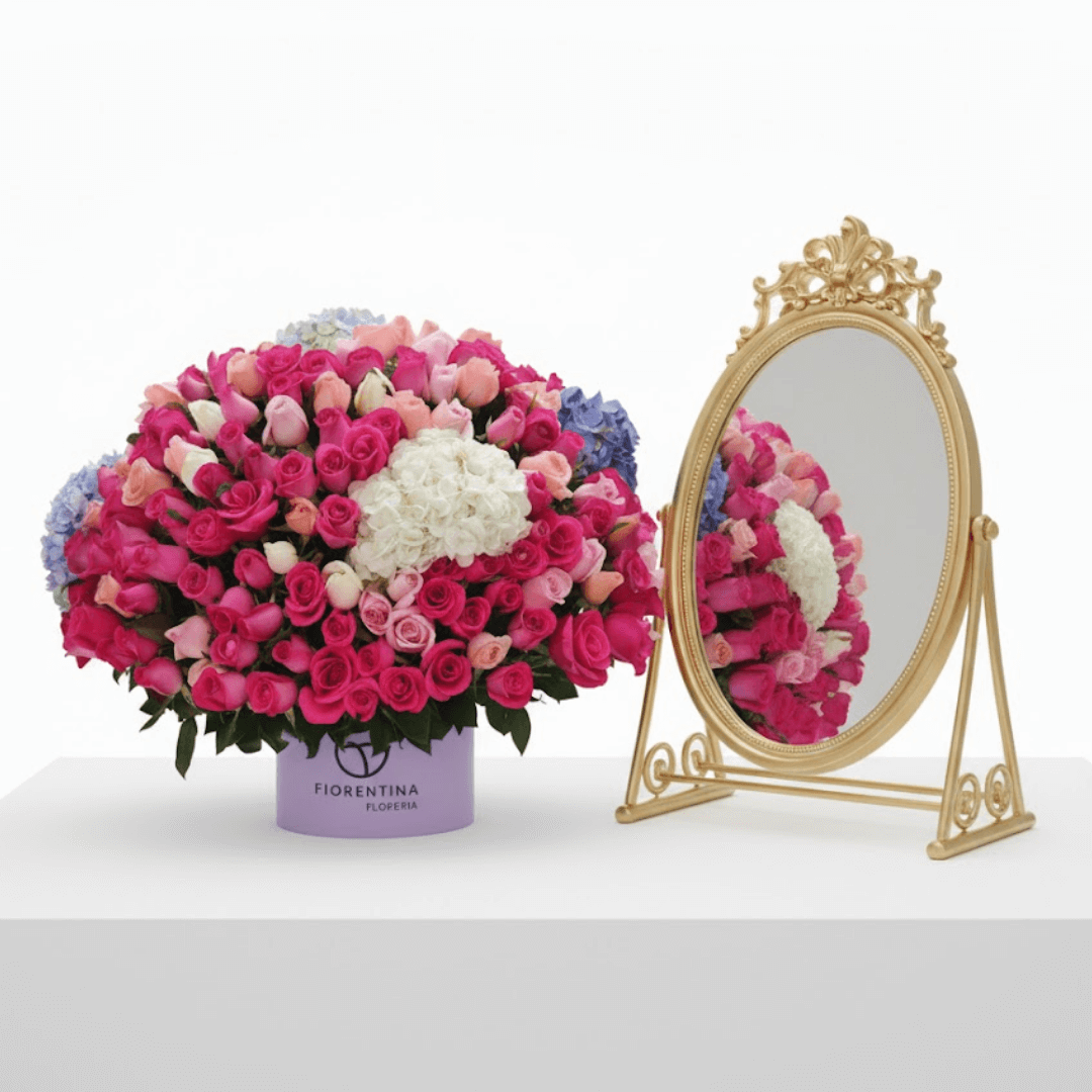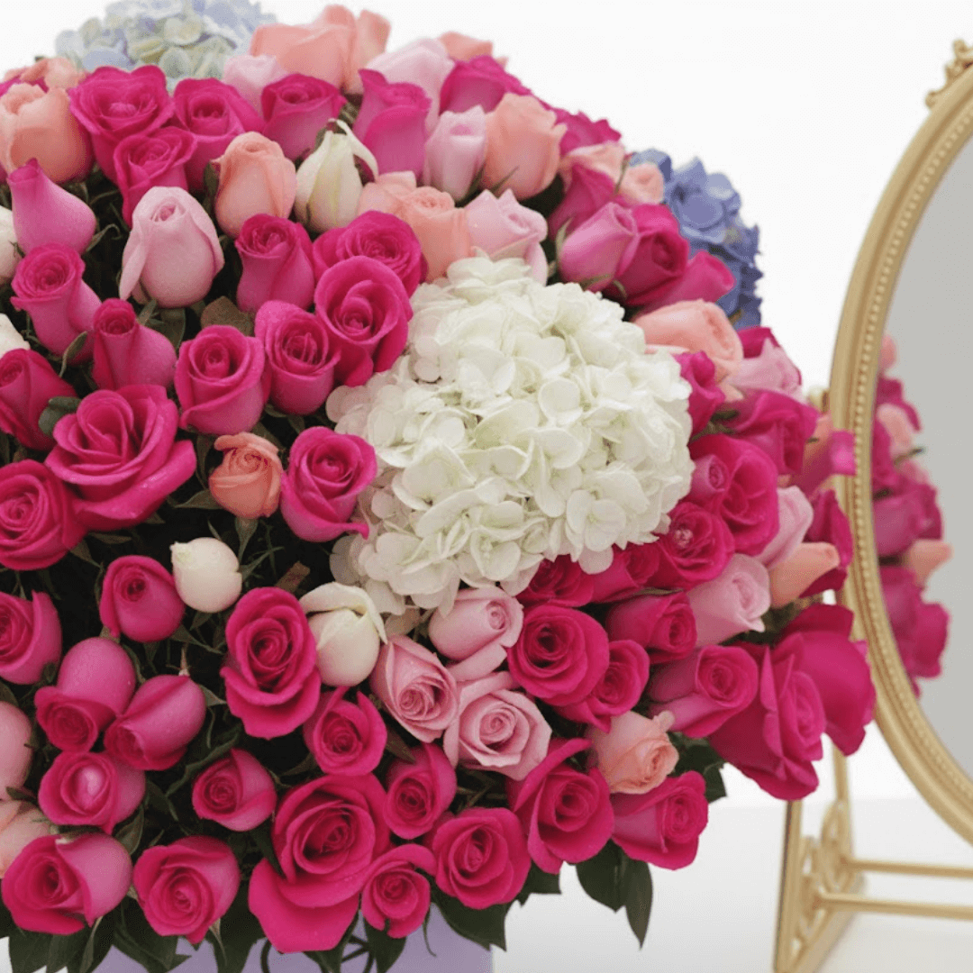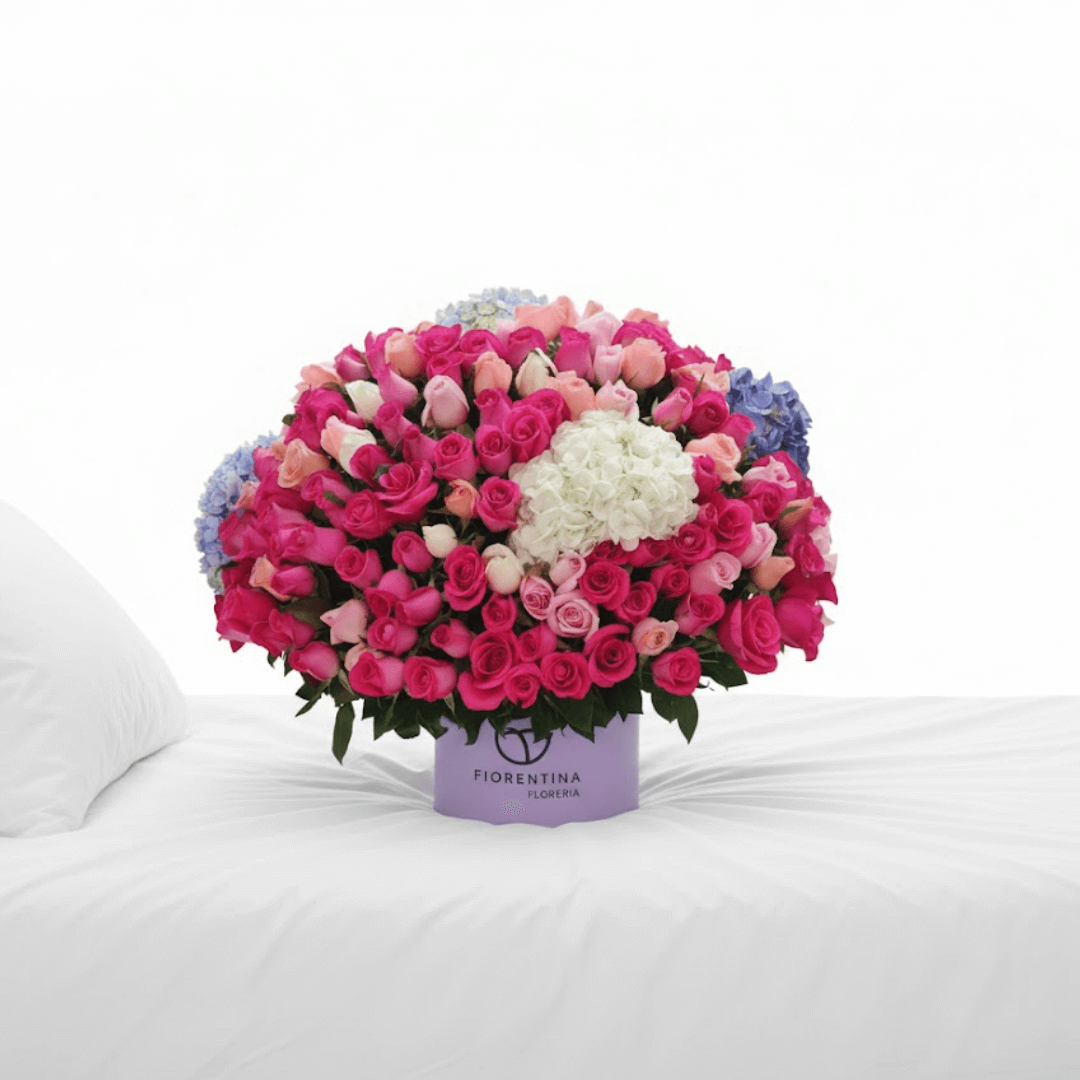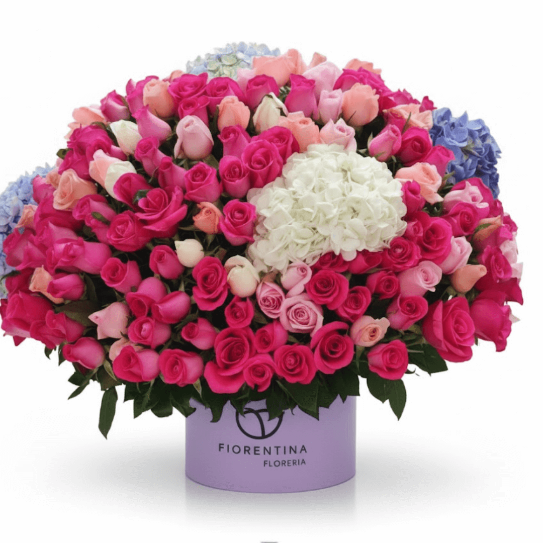 Arreglo floral en caja mediana con una opulenta mezcla de 300 rosas y 5 hortensias jumbo. El regalo perfecto de lujo y abundancia. ¡Personaliza con extras y solicita entrega a domicilio!