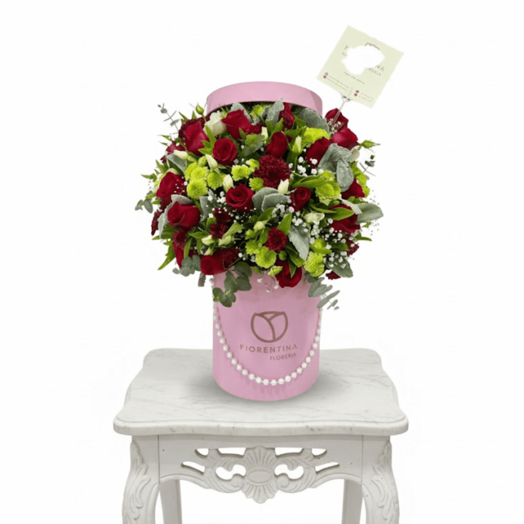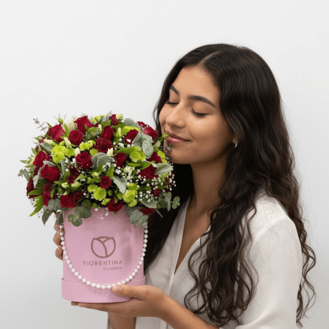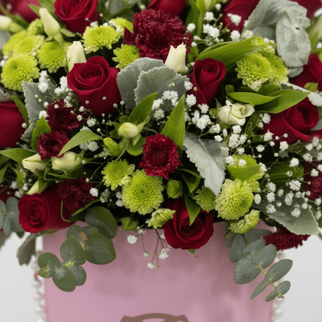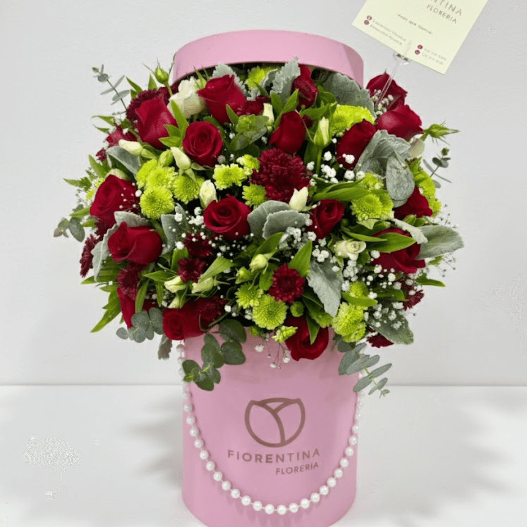 Hermosa caja floral que combina 24 rosas rojas, 10 tallos de margarita, 5 varas de mini rosas (mineu) y follajes finos. Un regalo vibrante y lleno de amor. ¡Personaliza con extras y solicita entrega a domicilio!
