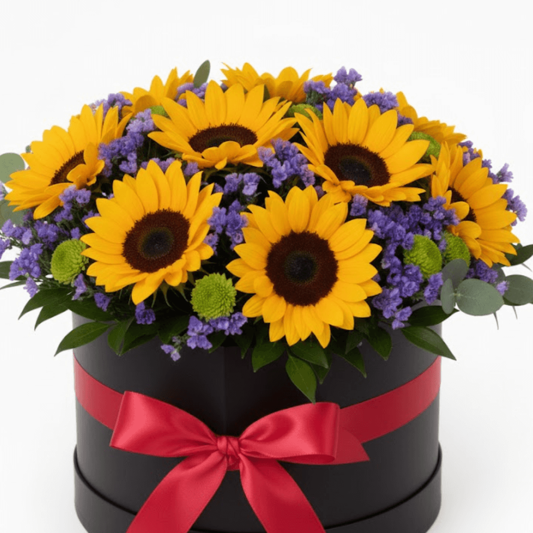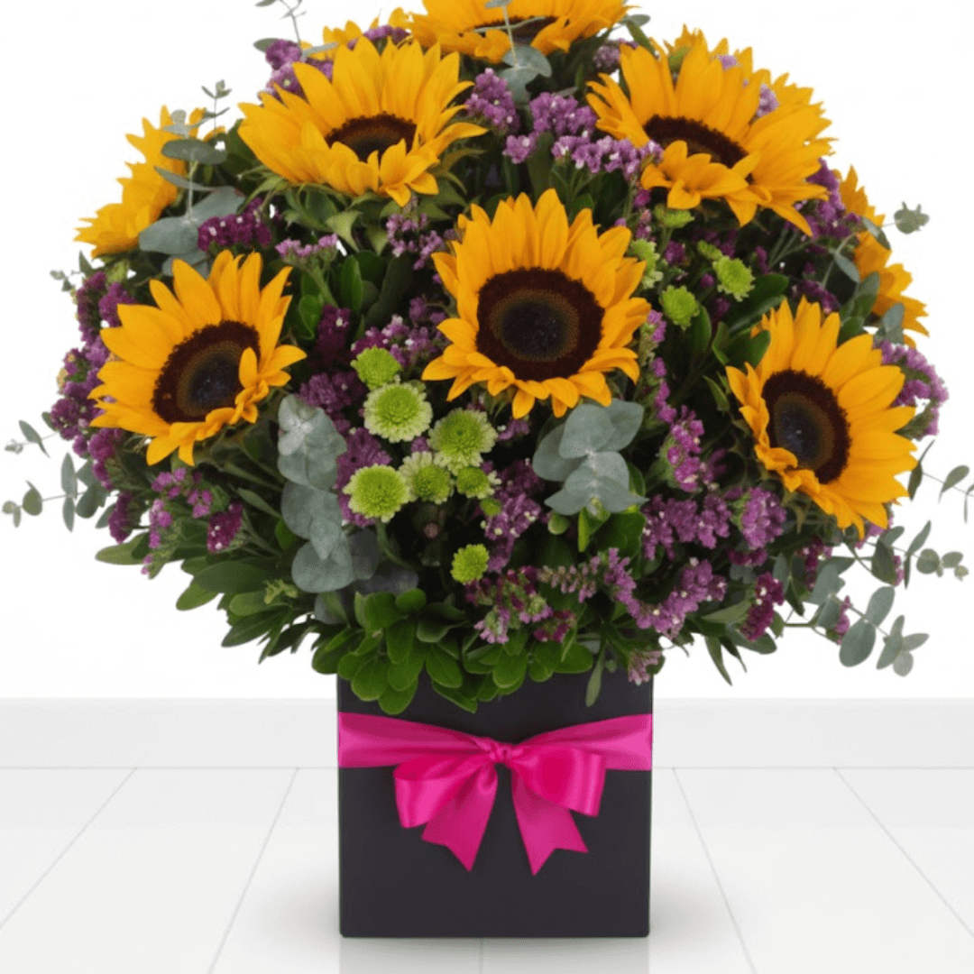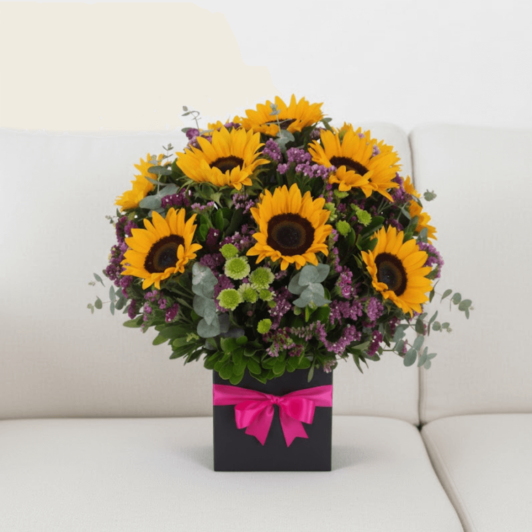 Caja cuadrada con 15 girasoles y follaje, ideal para sorprender o agradecer. Una composición llena de energía y optimismo.