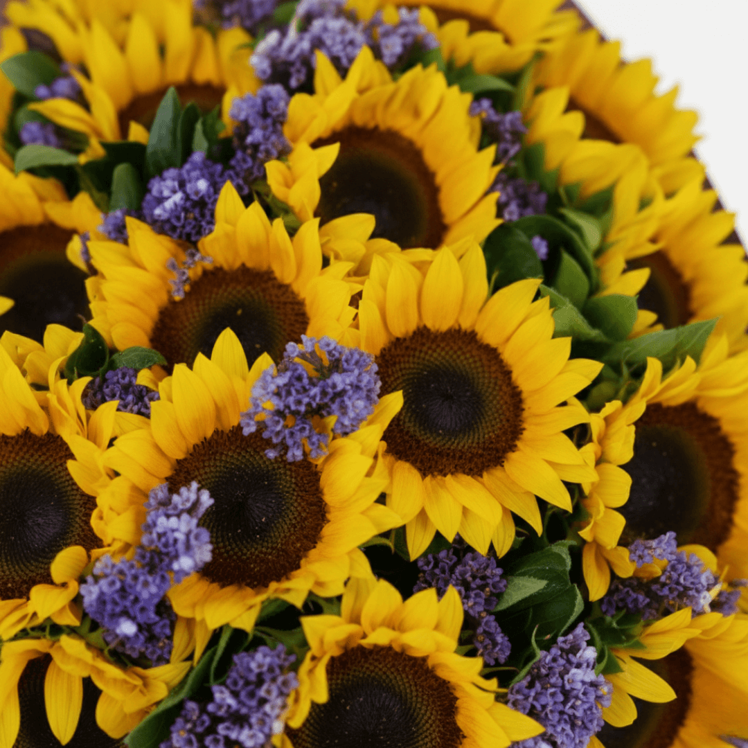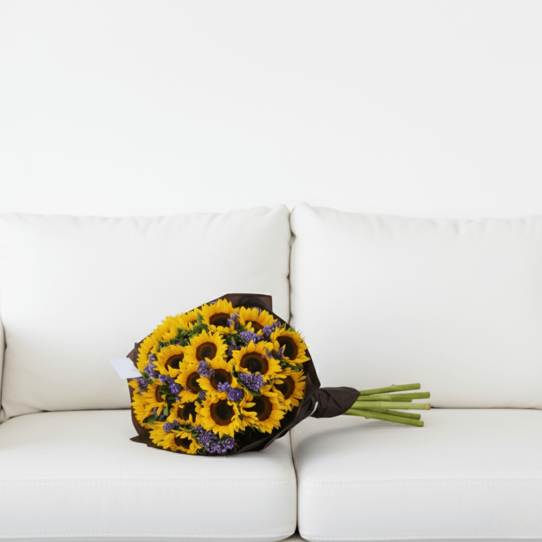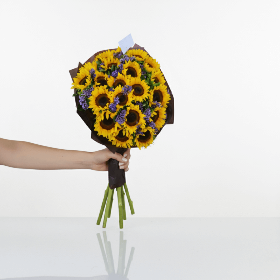 Ramo de 20 girasoles con follaje. Brillo, vitalidad y frescura en una sola composición. Perfecto para iluminar los días más especiales. Complementa tu arreglo y sorprende aún más. Añade dulces, chocolates, globos o un regalo especial de nuestra selección para hacerlo inolvidable. Cada detalle cuenta para crear un momento único.