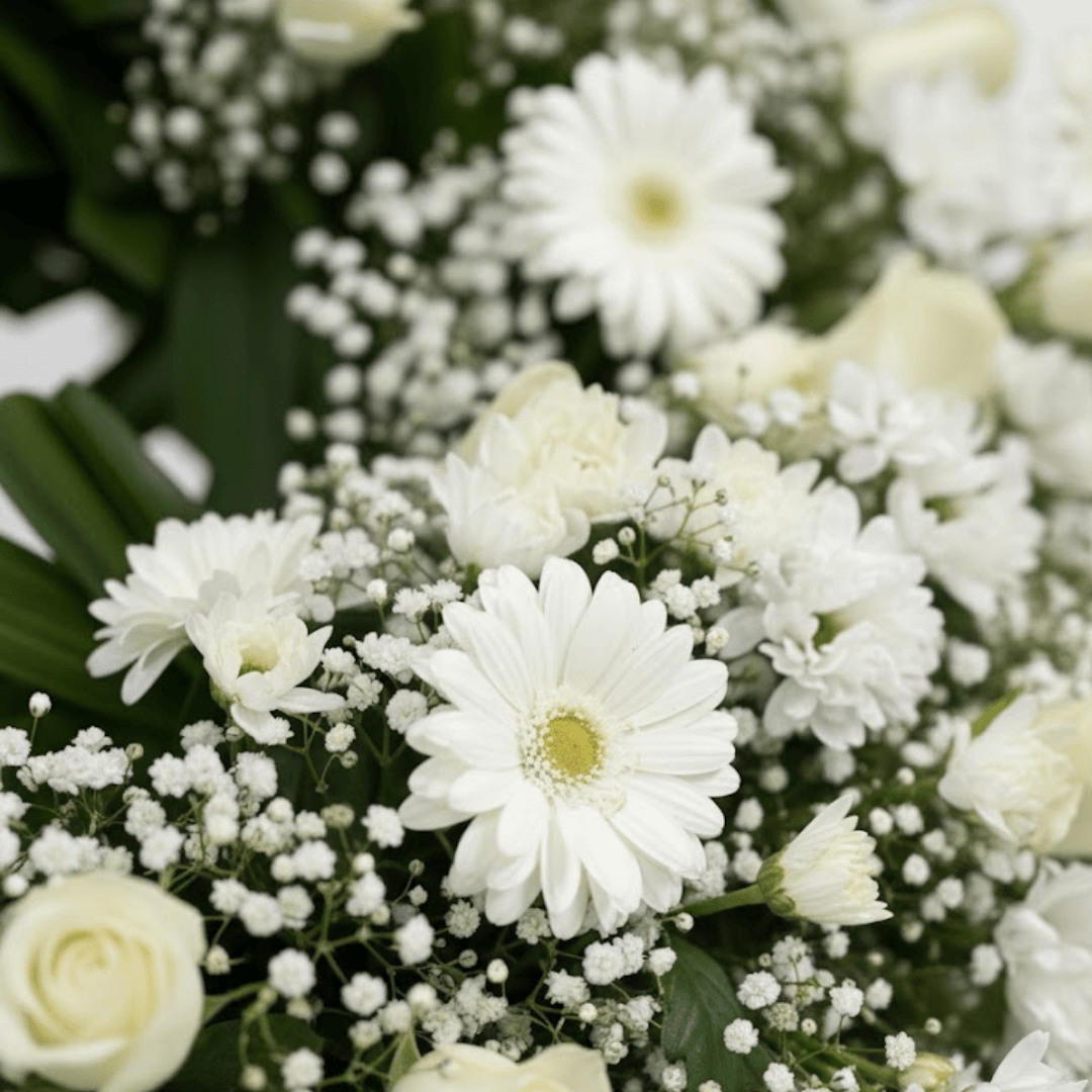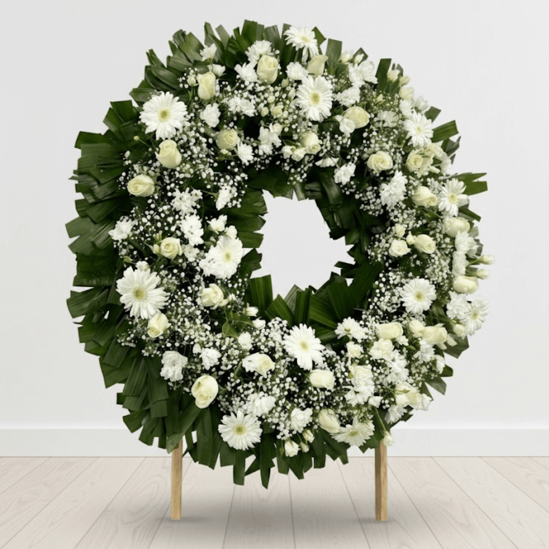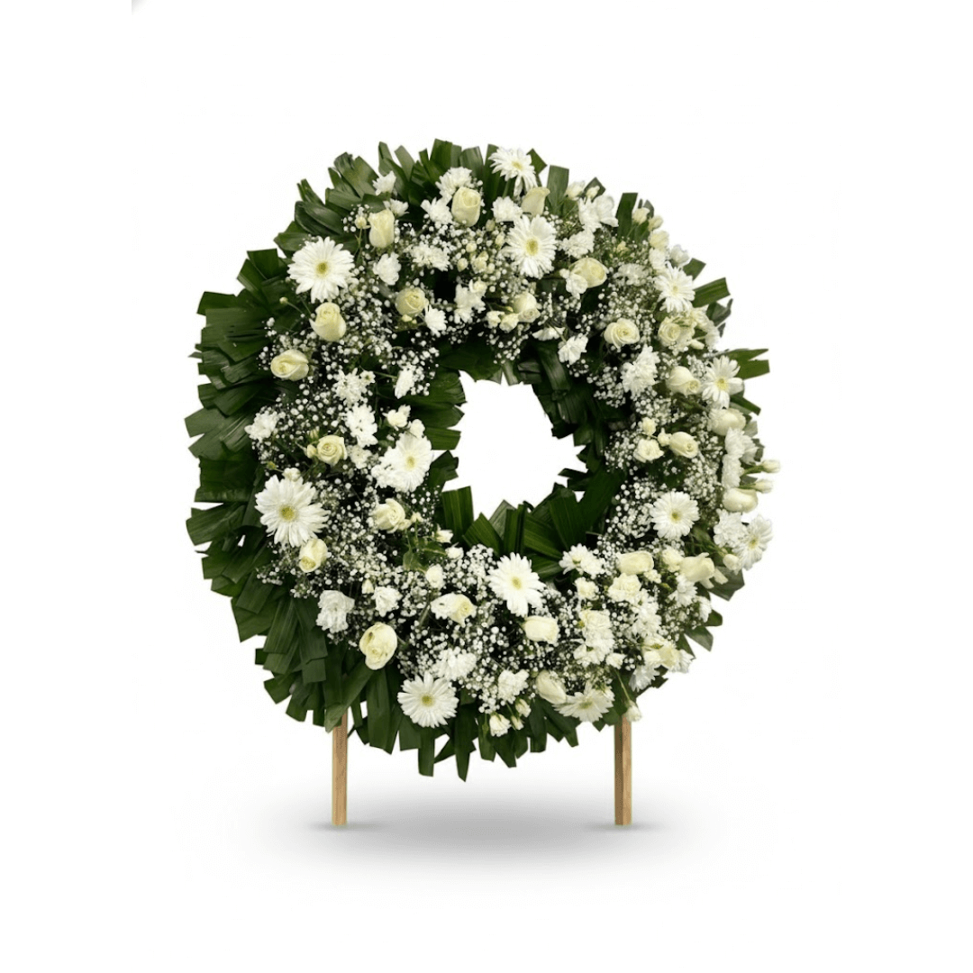 Elegante Corona Fúnebre con una mezcla de Rosas, Gerberas y Margaritas. Un tributo digno y respetuoso para expresar tus condolencias. ¡Personaliza con cinta y extras y solicita entrega a domicilio urgente!