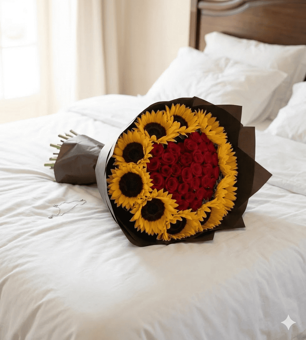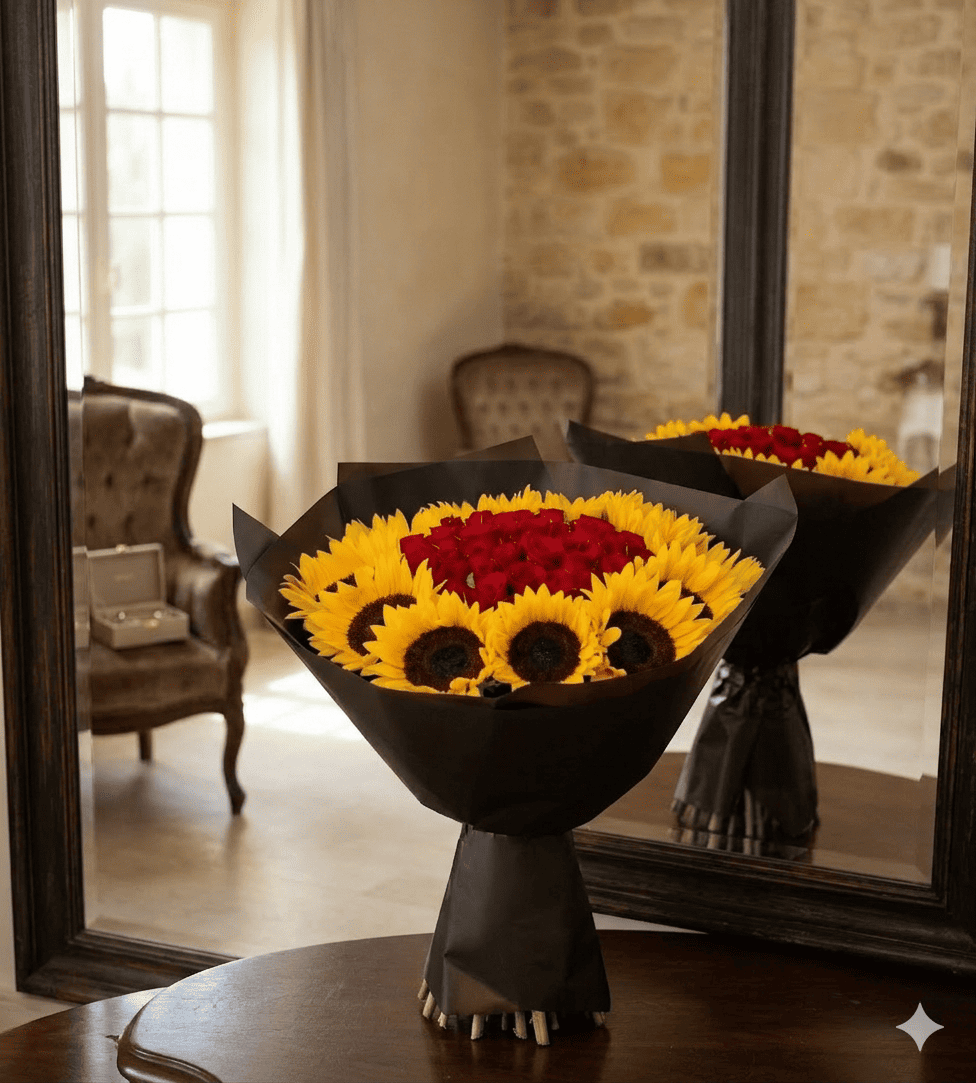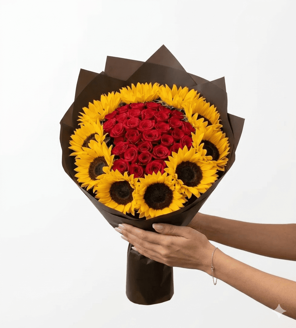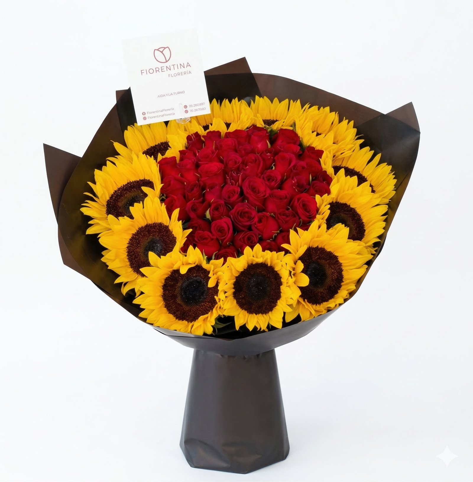 Nuestro Ramo de 50 Rosas y 12 Girasoles es una composición floral que combina sofisticación y vitalidad en un mismo arreglo. Al integrar la elegancia atemporal de 50 rosas con la energía radiante de 12 girasoles, este diseño crea una armonía visual que transmite alegría, admiración y afecto genuino. La presencia luminosa de los girasoles aporta calidez y optimismo, mientras que las rosas añaden un toque de romanticismo y distinción, dando como resultado un contraste natural que destaca por su volumen y belleza.