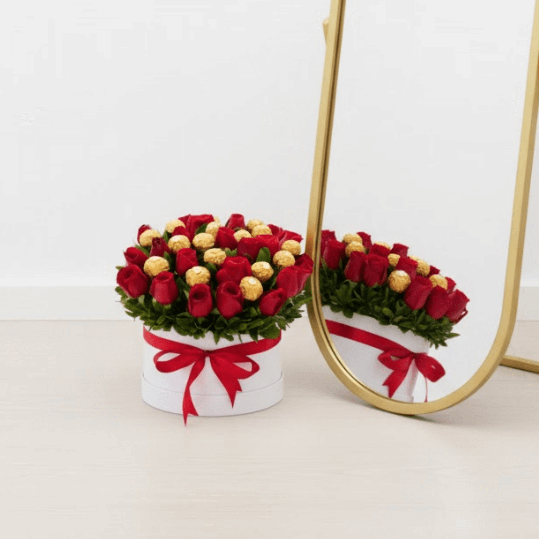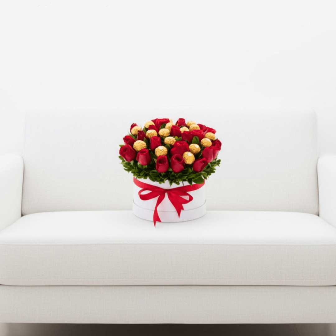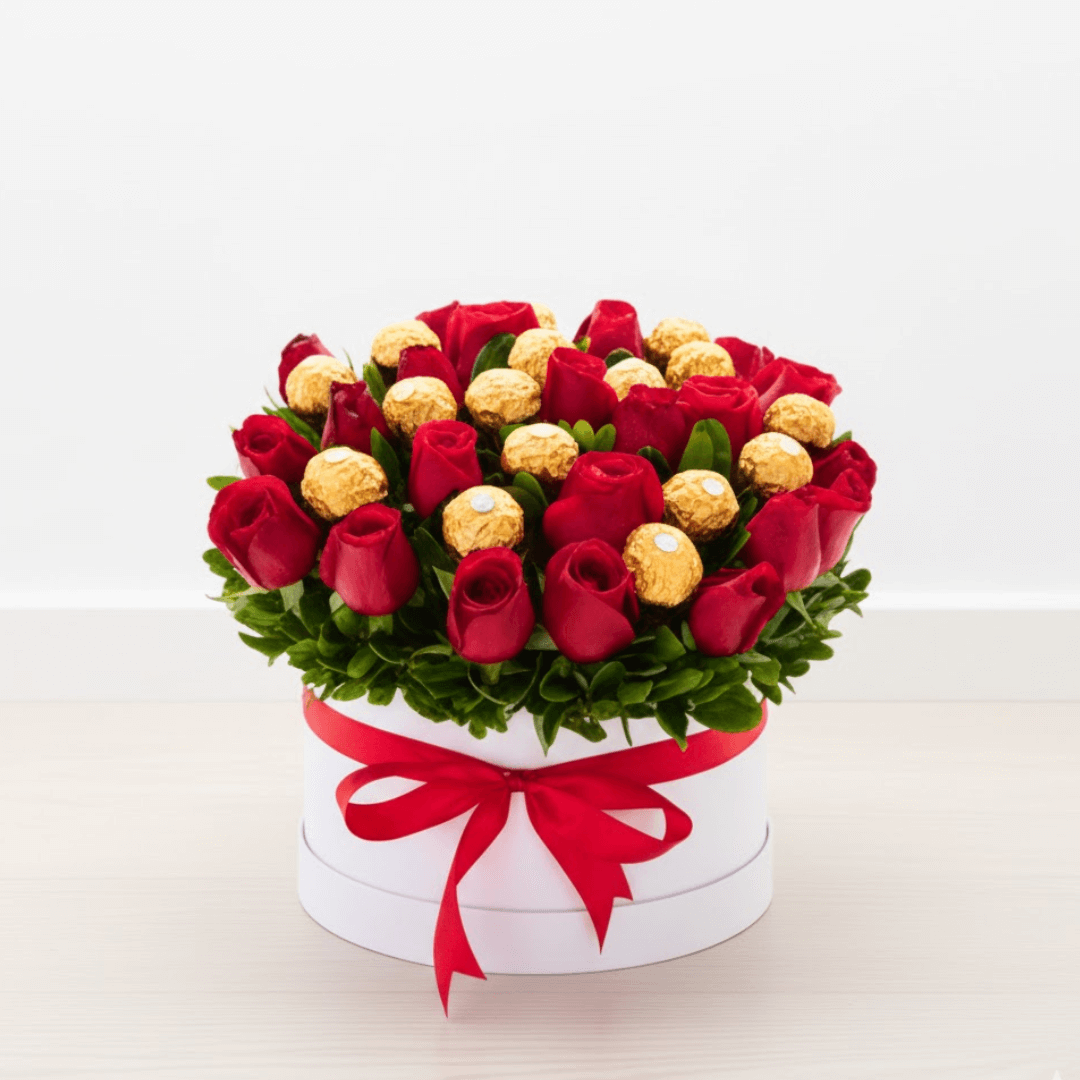 Caja redonda con 24 rosas y 16 chocolates, un regalo que combina ternura y pasión. Perfecto para agradecer o alegrar el día.