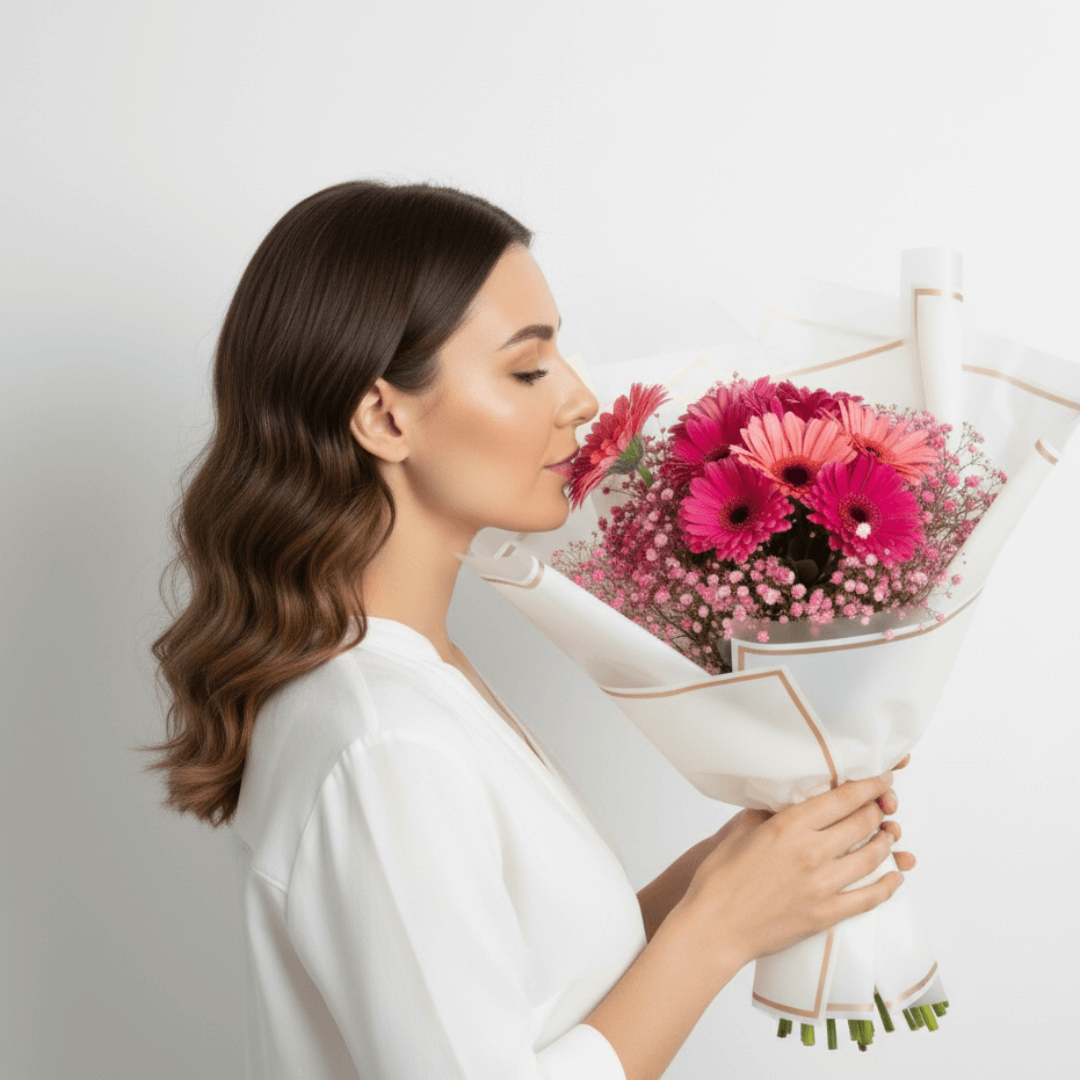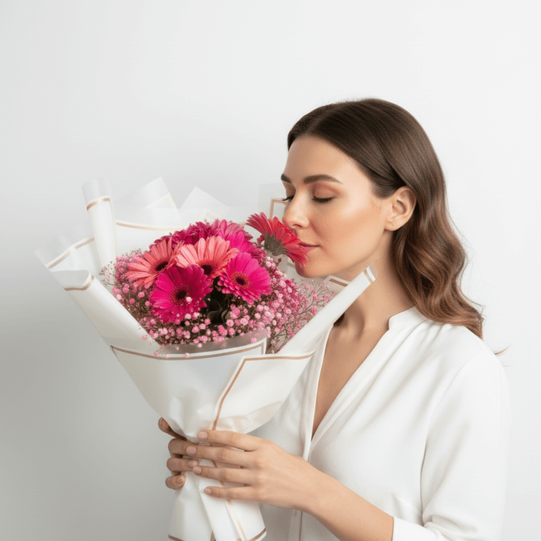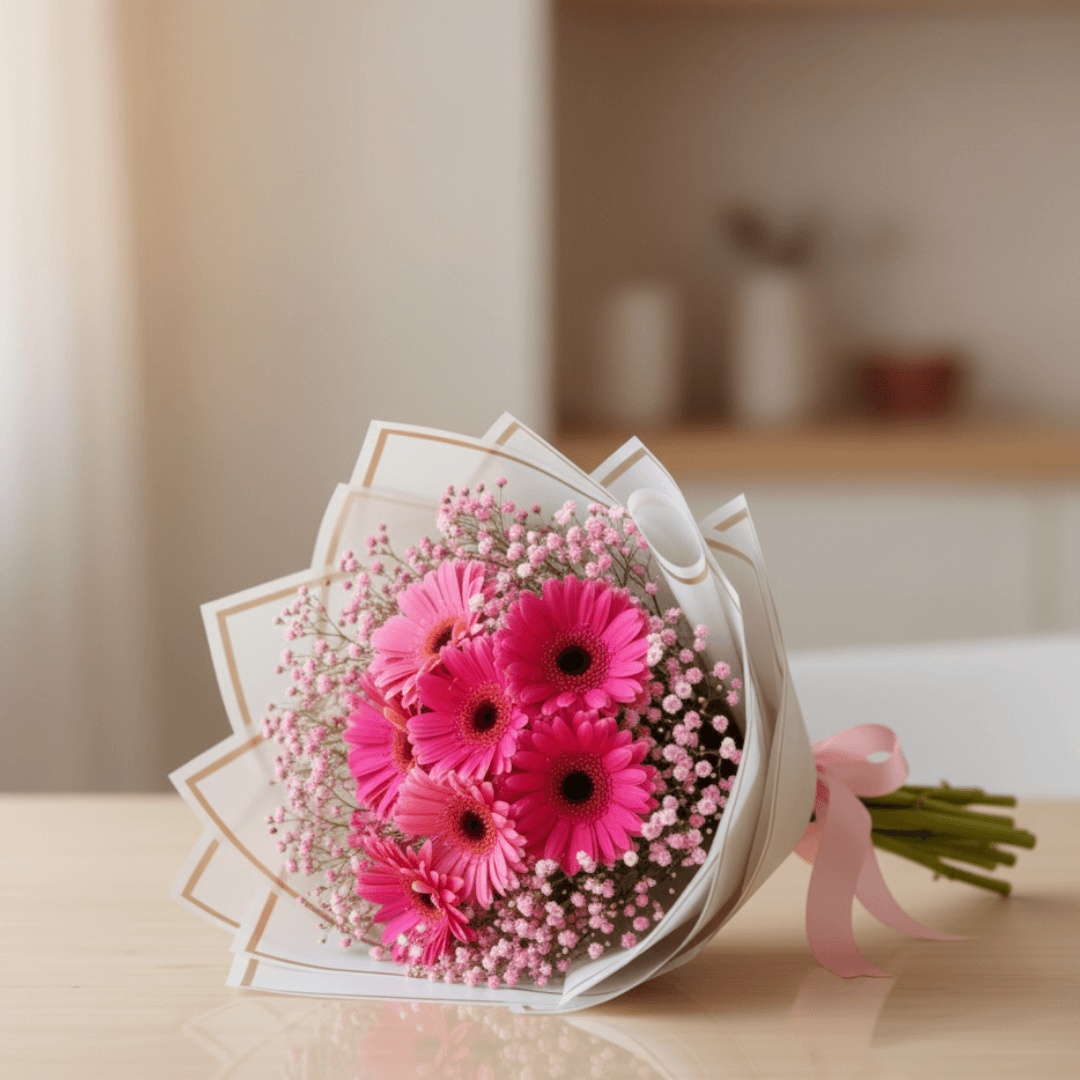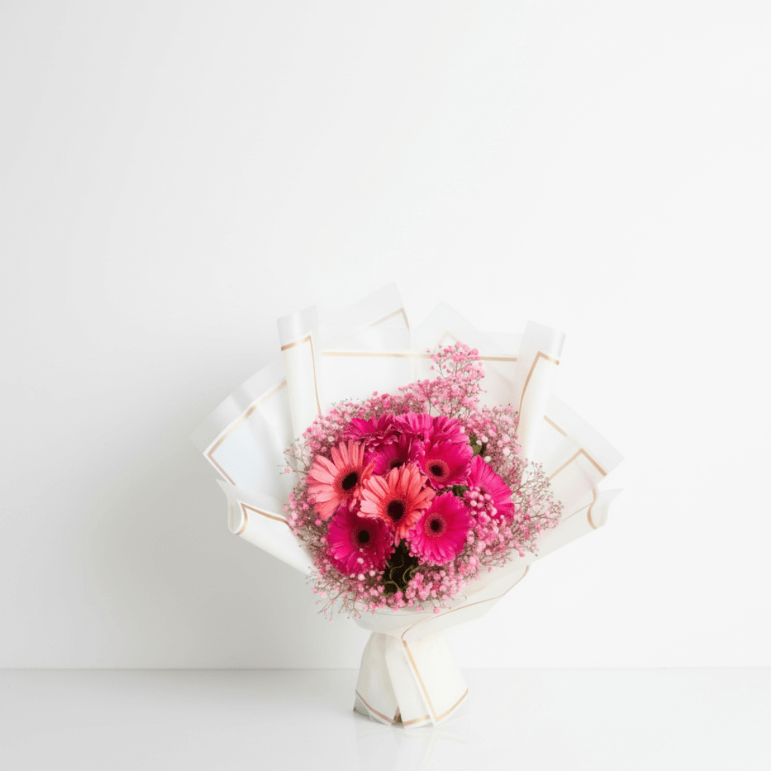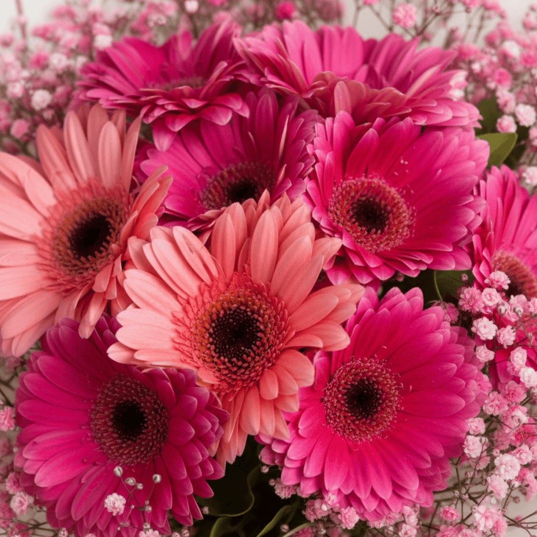 Ramo de 9 gerberas con gypsophila pintada. Ligero, delicado y perfecto para un gesto sincero. ¡Demuestra cariño con un toque floral único!