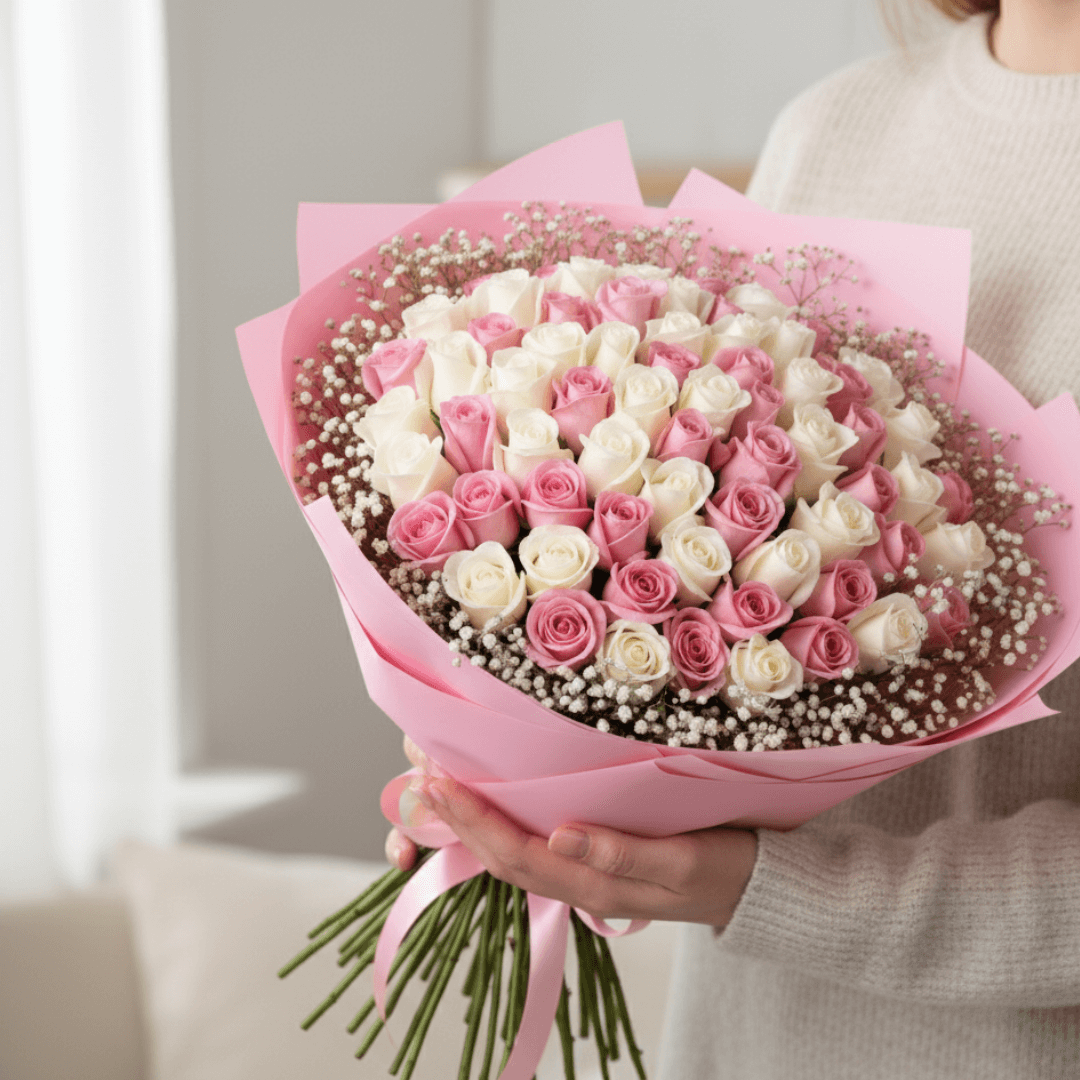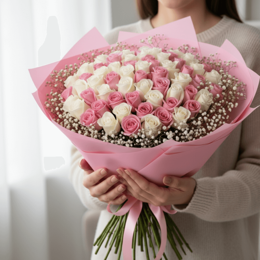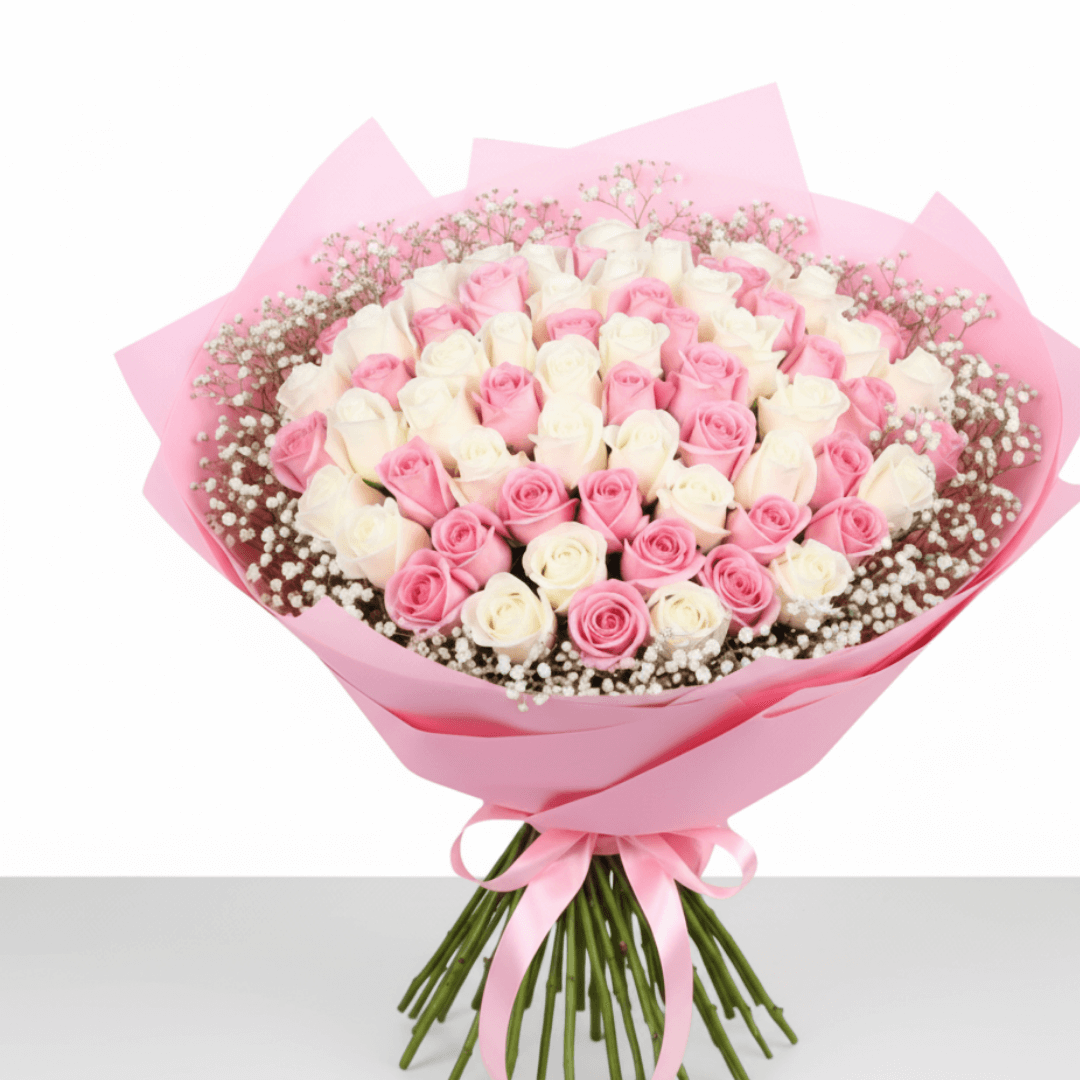 Ramo de 150 rosas con gypsophilia blanca, diseñado para resaltar la pureza y el romanticismo. Un detalle clásico que ilumina cualquier celebración especial.