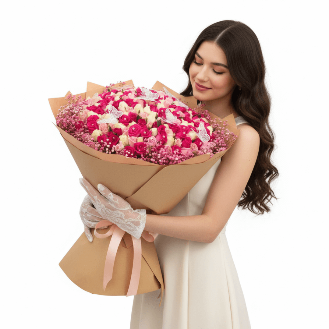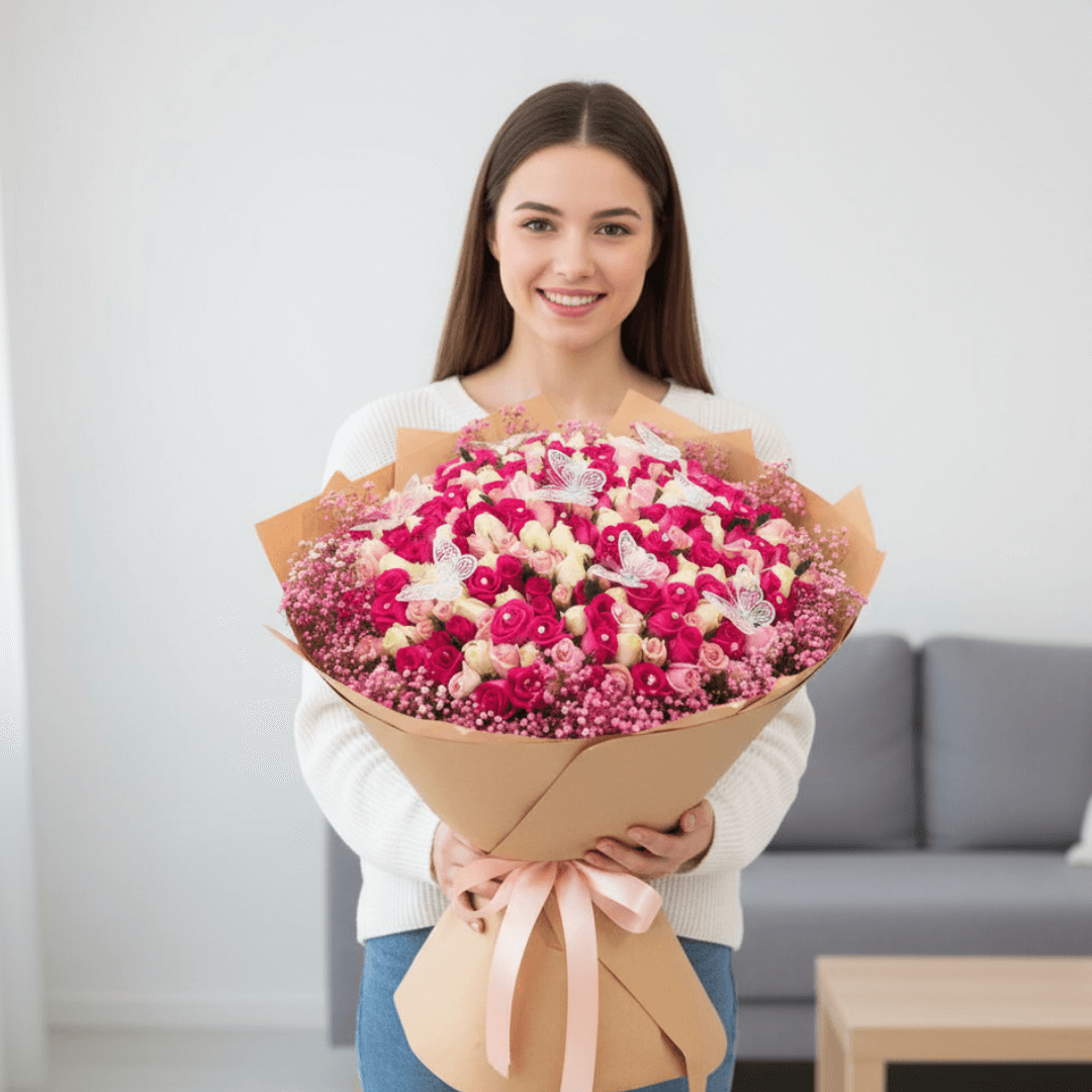 Un majestuoso ramo de 300 rosas, gypsophilia pintada y 7 mariposas. Ideal para XV años y graduaciones, este arreglo representa elegancia, juventud y un amor digno de cuento.