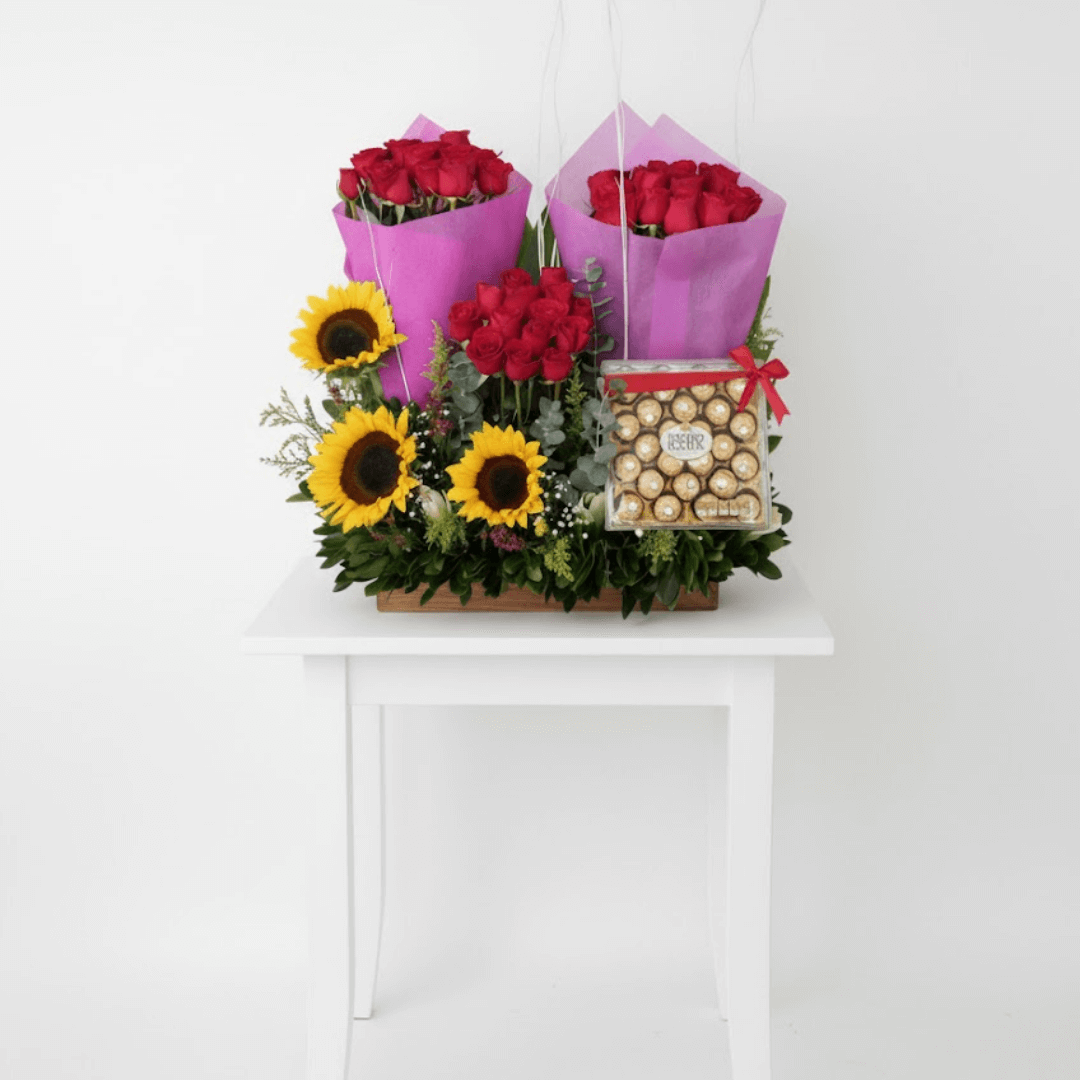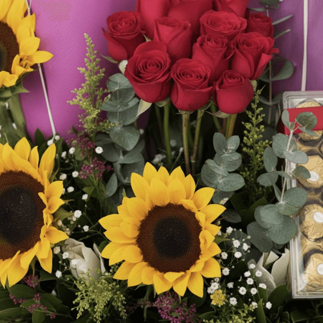 El regalo completo: Ramo de 50 rosas, 3 girasoles y una caja de 24 chocolates. La combinación perfecta de flores y dulzura. Envío a domicilio en Toluca y Metepec.