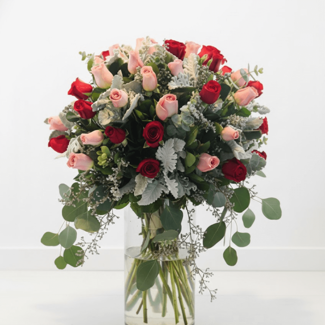 Arreglo en jarrón de 50 rosas, dólar, miller y limonium
