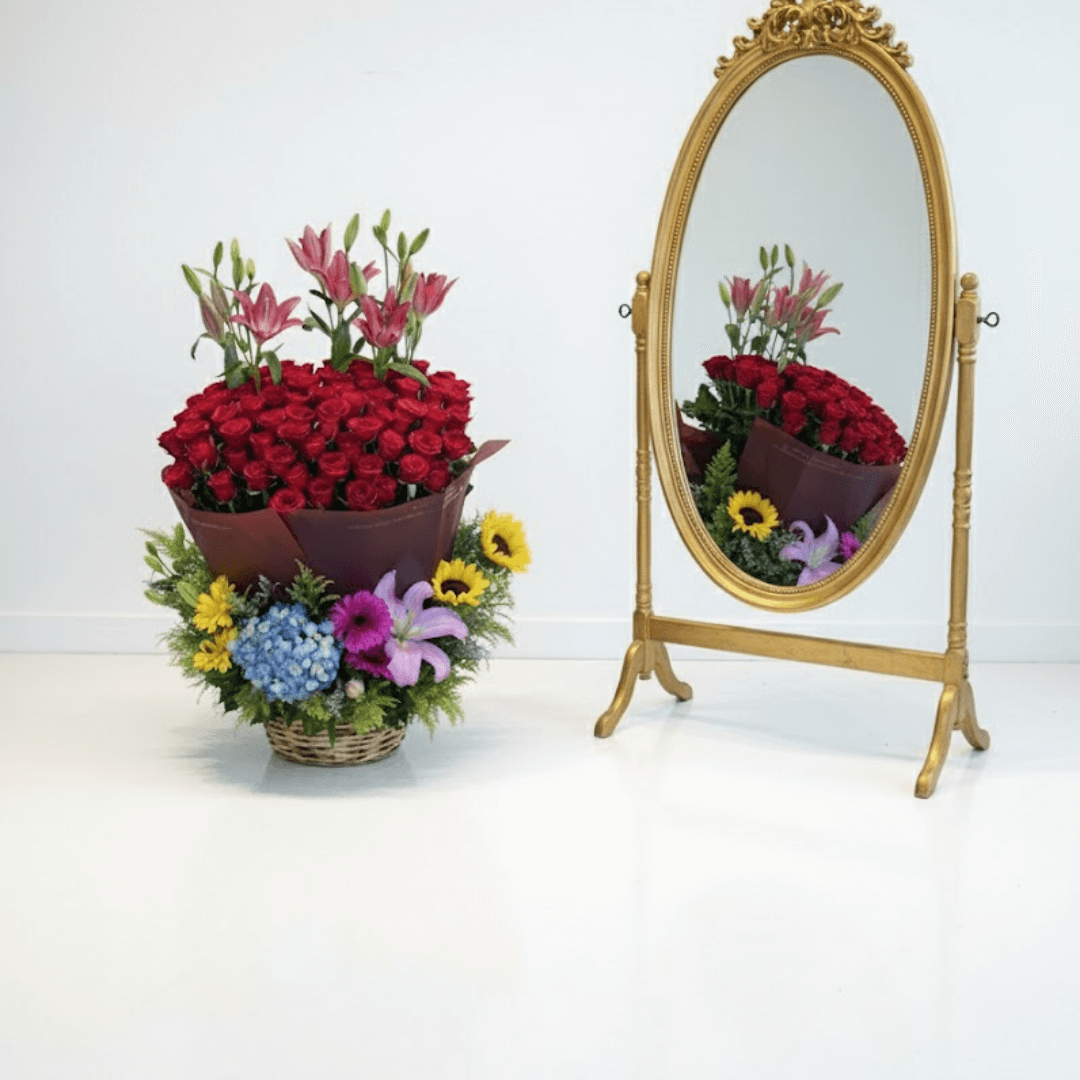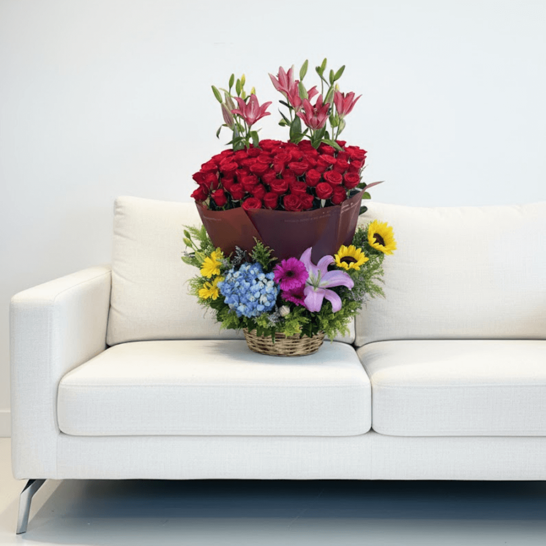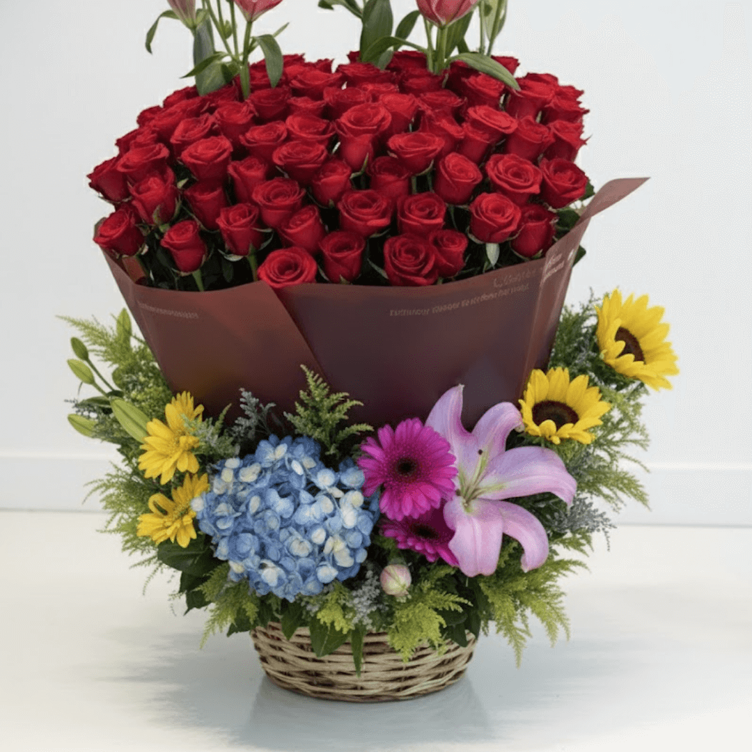 Hermoso canasto con una mezcla vibrante de 75 rosas, 4 lilis, 4 gerberas, 2 girasoles y hortensia grande. Un arreglo de ensueño. ¡Personaliza con extras y recibe con entrega a domicilio!