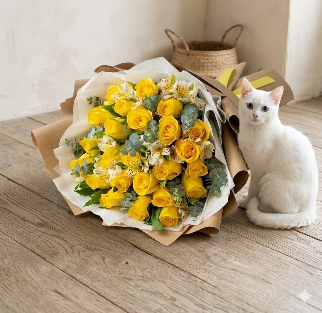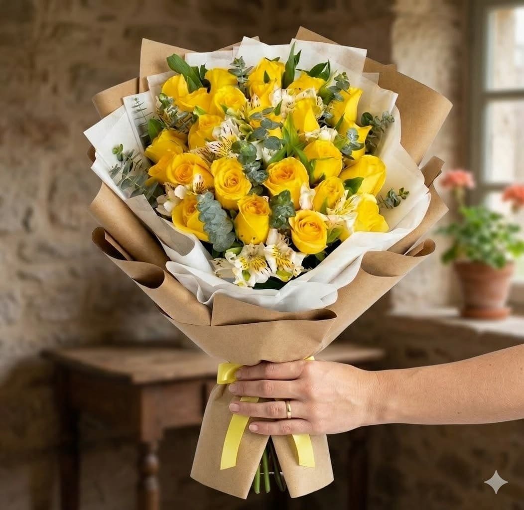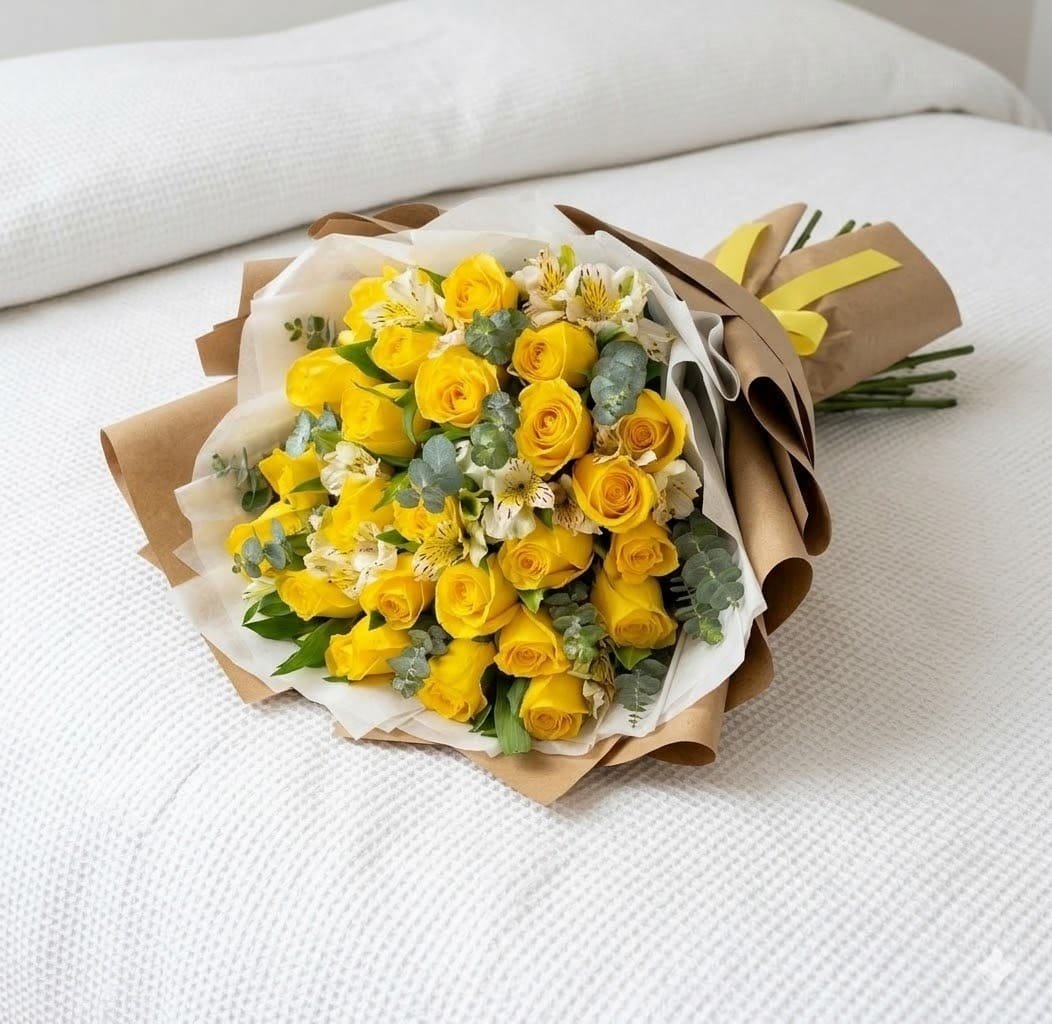 • El Ramo de 24 Rosas Amarillas combinadas con Astromelia y Dólar es la máxima expresión de alegría y buenos deseos. Este diseño no solo destaca por su vibrante color dorado, sino por la exquisita mezcla de texturas que lo convierten en una pieza de decoración viva, ideal para quienes desean regalar un impacto positivo inmediato. En nuestra florería, cuidamos cada tallo para que el mensaje llegue fresco y radiante.