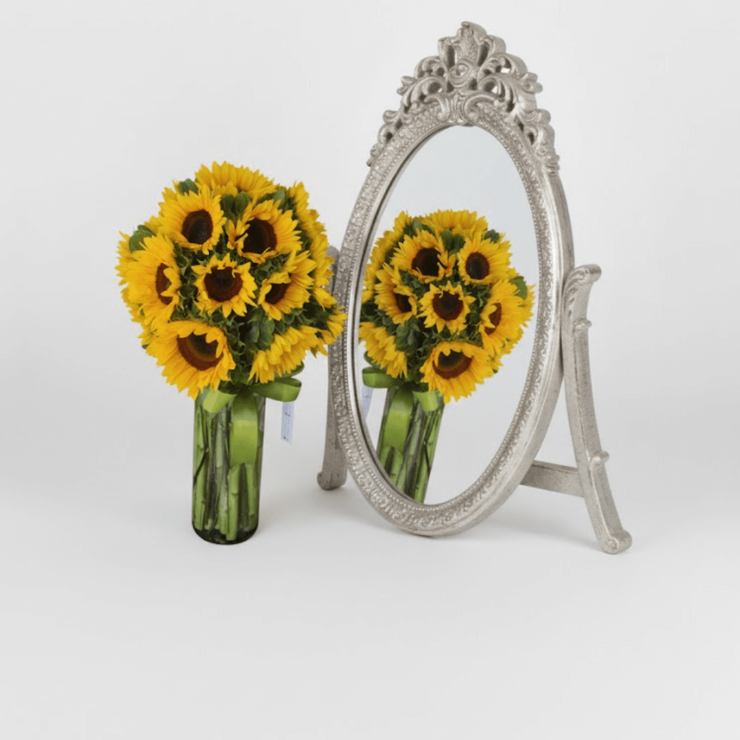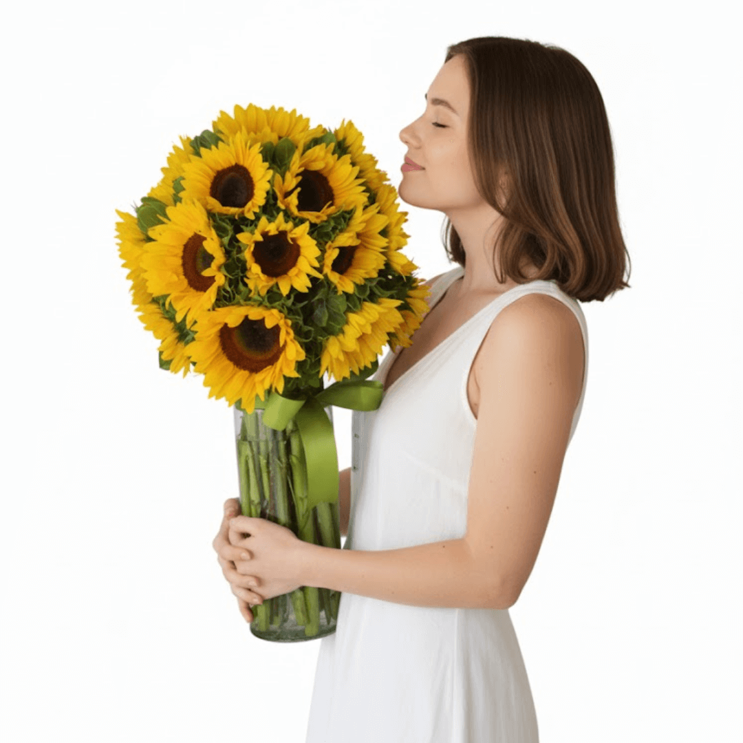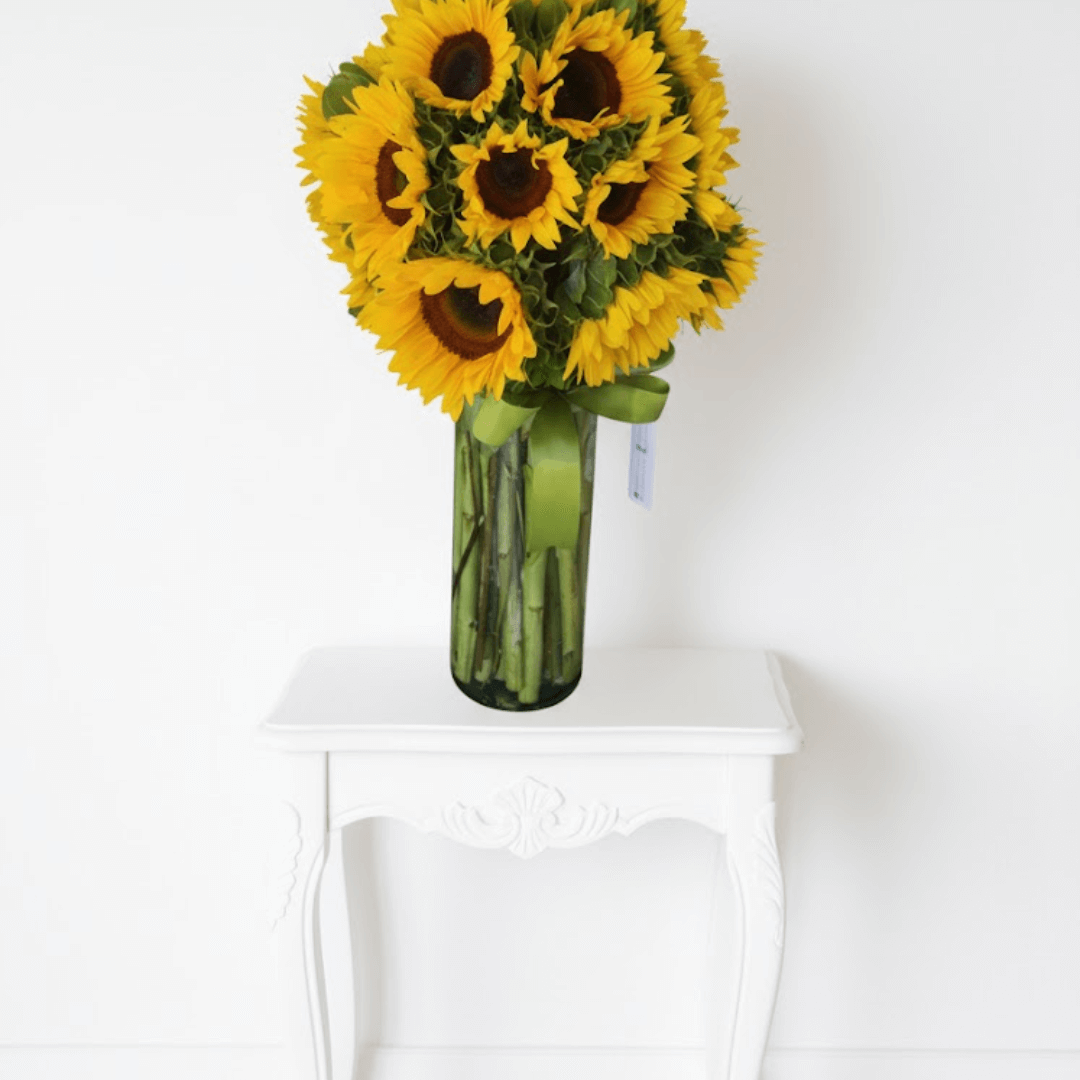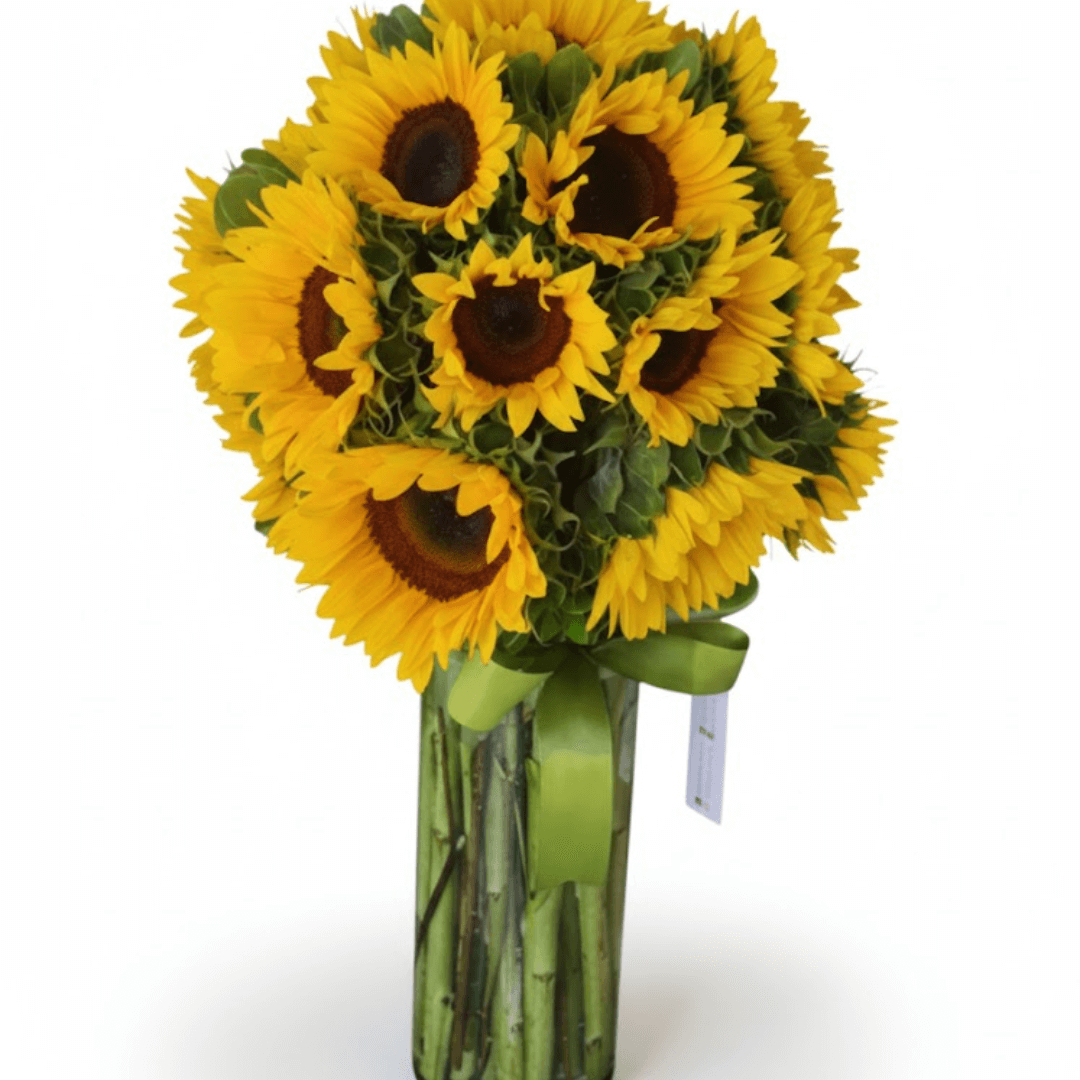 Arreglo de 20 Girasoles frescos en jarrón. El regalo perfecto para dar luz, Alegrar el Día, Agradecer o Enamorar. ¡Pide hoy tu dosis de energía y optimismo a domicilio! Complementa tu arreglo y sorprende aún más. Añade dulces, chocolates, globos o un regalo especial de nuestra selección para hacerlo inolvidable. Cada detalle cuenta para crear un momento único.