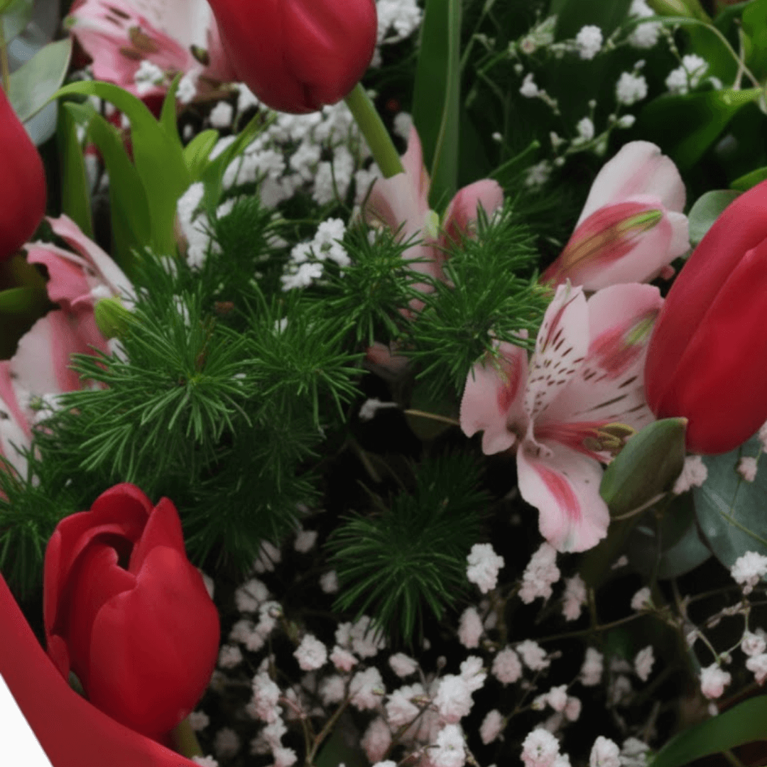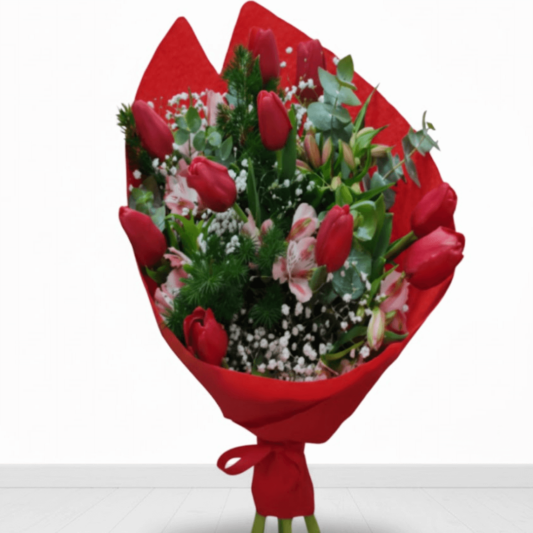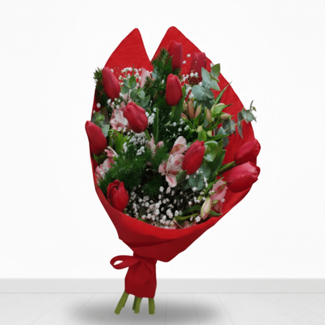 Con 10 tulipanes y toques de color, este arreglo transmite alegría y encanto. Ideal para iluminar espacios o celebrar momentos llenos de amor.