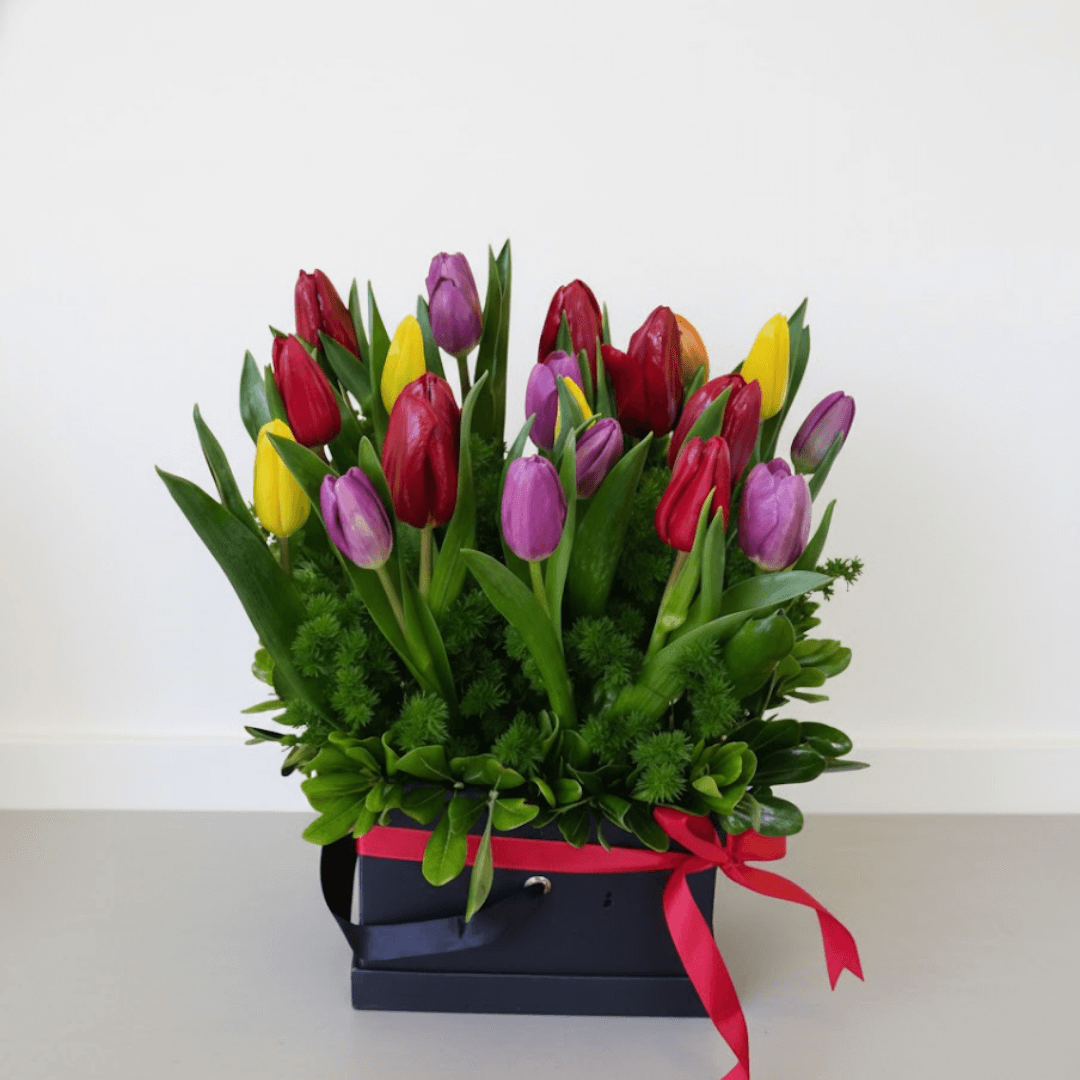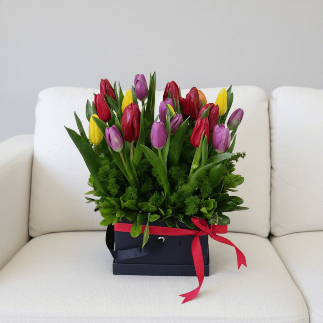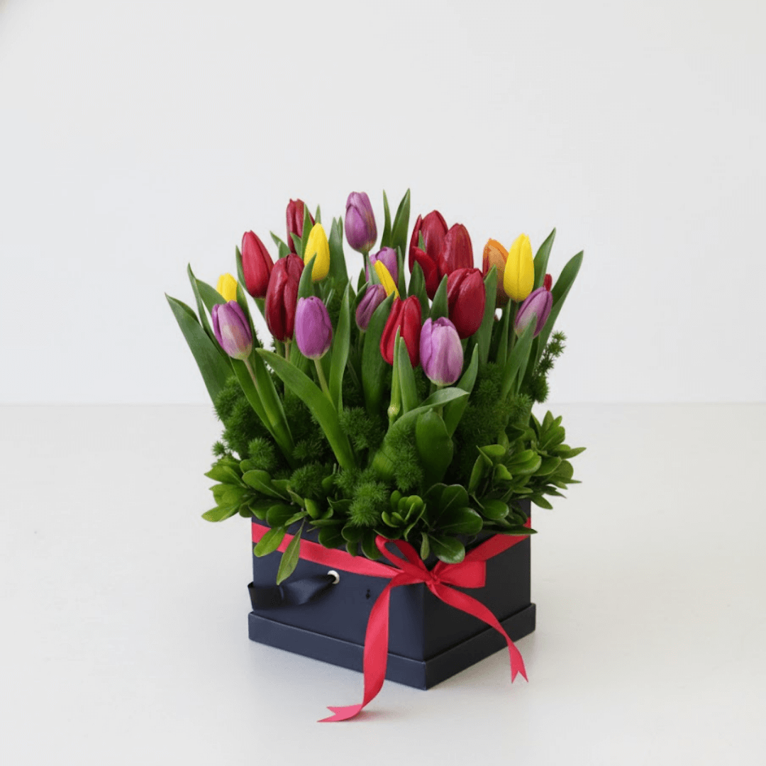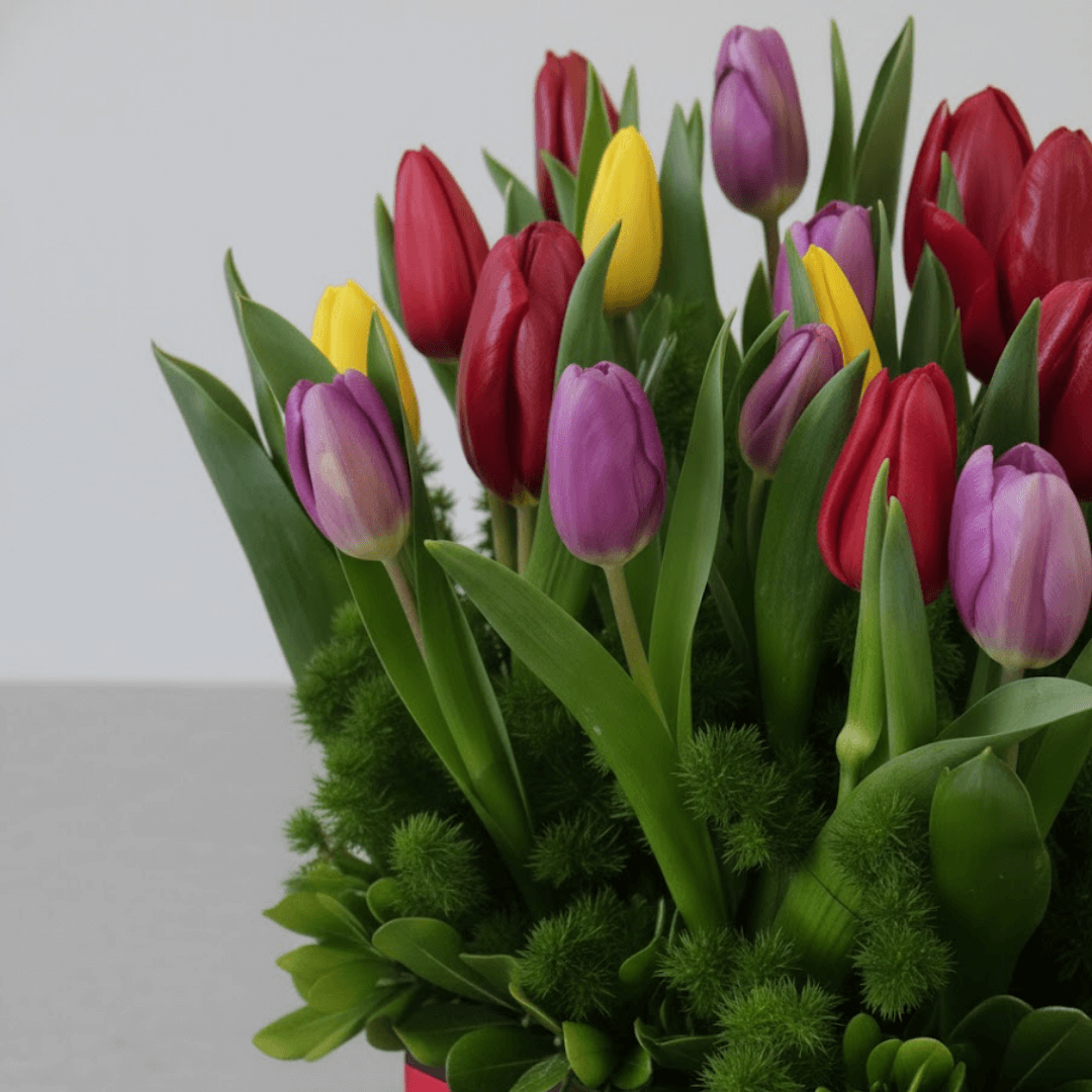 El detalle perfecto para un gesto sincero. Este arreglo en caja con 20 tulipanes y follaje transmite pureza y amor en cada tallo. Su presentación elegante realza cualquier ocasión especial.