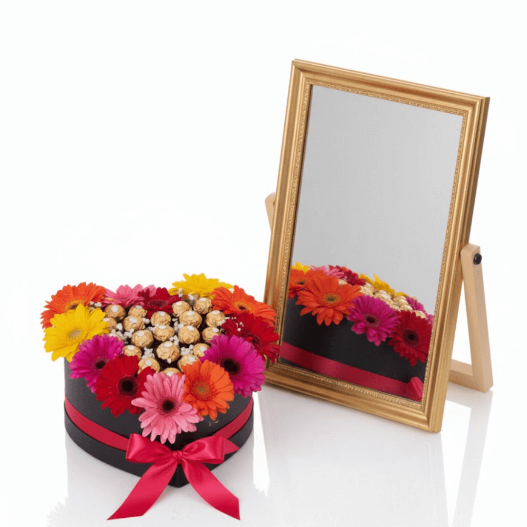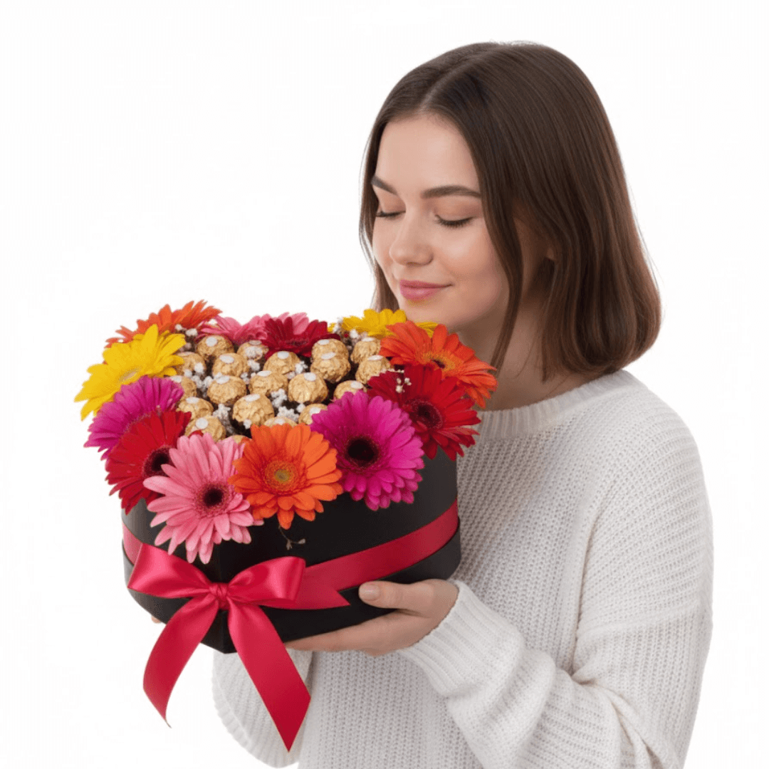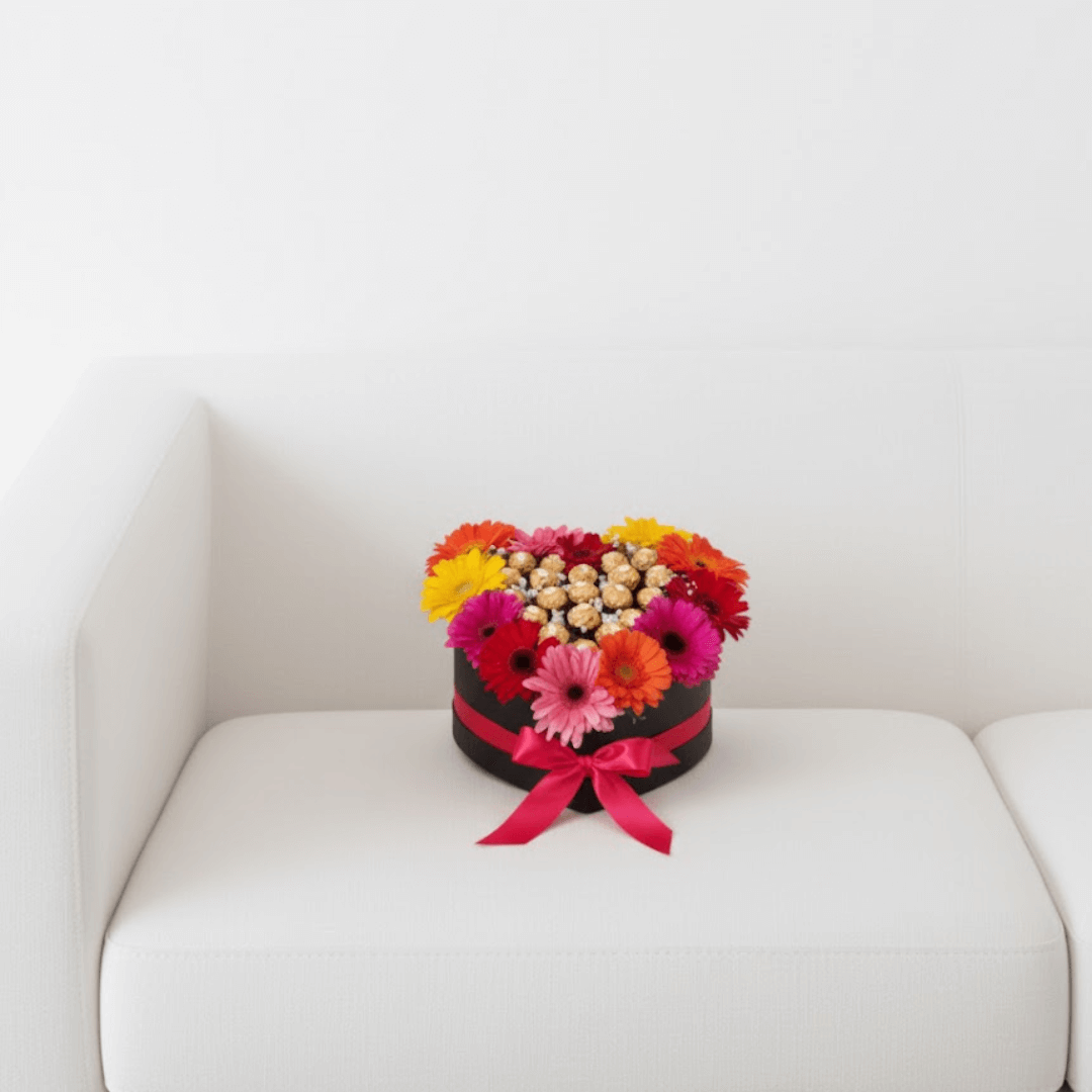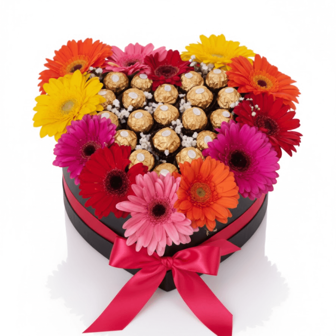 Arreglo en forma de corazón con 12 gerberas y 20 chocolates. Ideal para enamorar o alegrar el día con un detalle dulce y sofisticado.